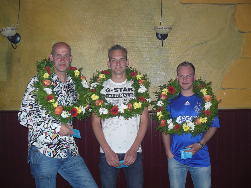 Bij de heren waren zes parturen geloot in twee poules. De finale bij de heren ging uiteindelijk tussen het partuur van Jan-Jelle Jongsma, Sjoerd Pietersma en Henk Peterson tegen het partuur van Roelof van der Veen, Jouke Dantuma en debuterend nieuw lid Henk Deelstra. In een leuke en enigszins spannende finale gingen de kransen naar kopman Roelof, die zich ontpopt tot een doorgewinterde sportman, routinier Jouke en de verfrissend kaatsende Henk. Op de foto de “brune snutsjes” van de winnaars tijdens de prijsuitreiking in Café Us Thus. Voor meer foto’s verwijzen wij naar de website kflytsbegjin.nl