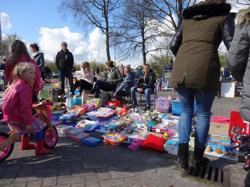Stralend weer op de Vrijmarkt in Damwâld. Een druk bezochte vrijmarkt met veel handel en vertier voor de kinderen met onder andere springkussens.