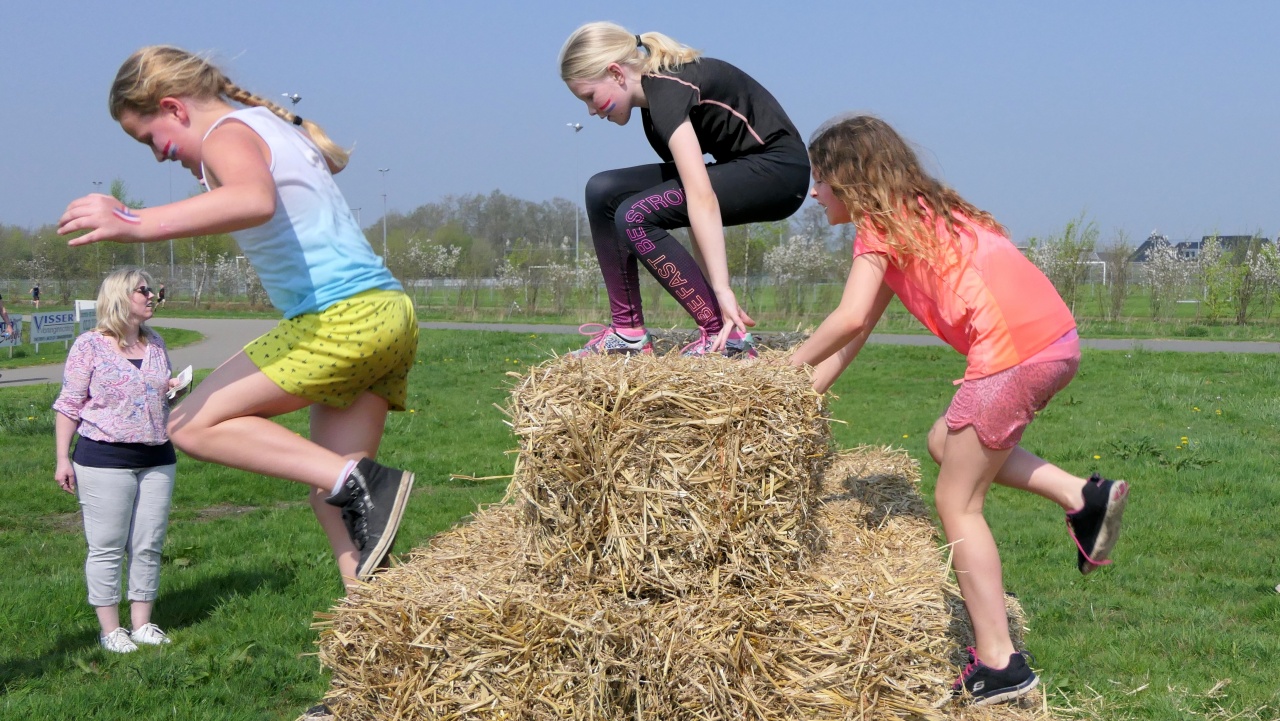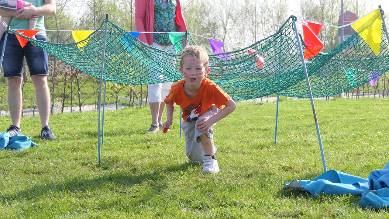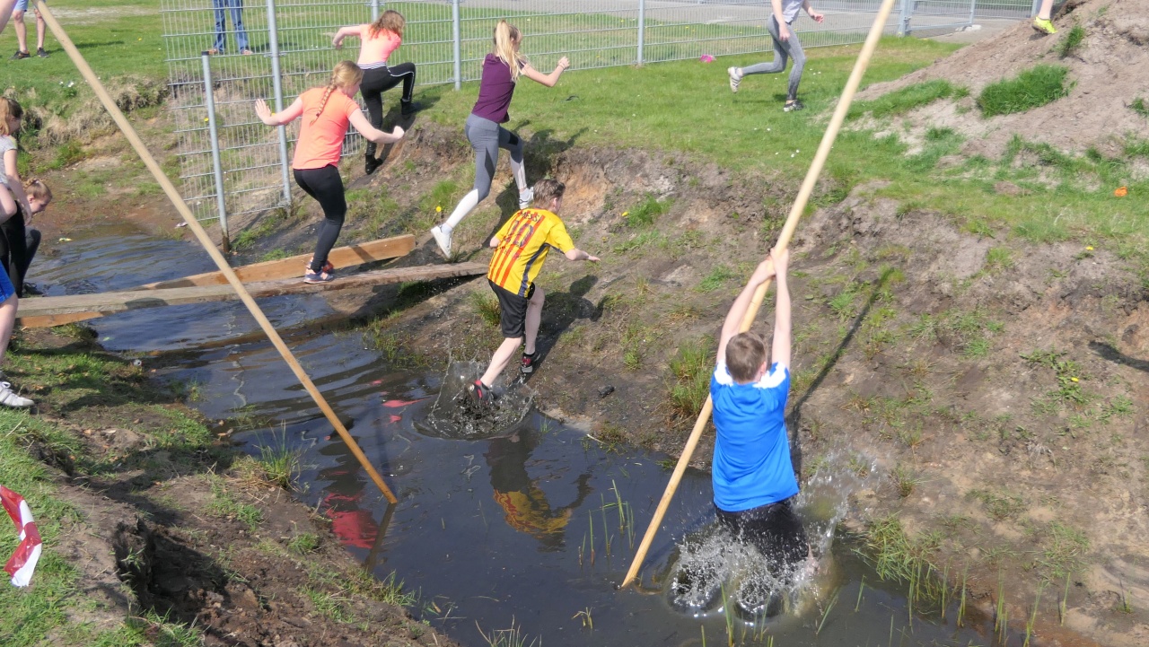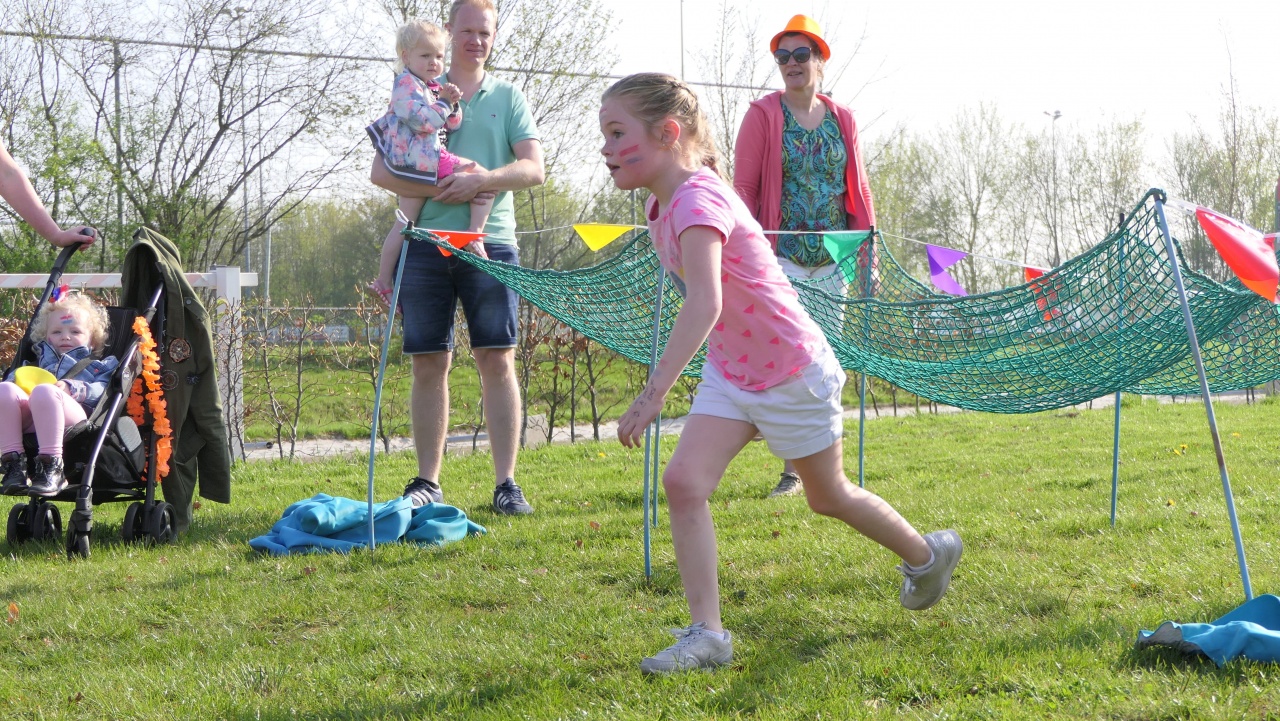 Om 12:30 uur was de bovenbouw aan zet. De Wrotrun. Achter de school, rondom de wielerbaan, was er een survivalbaan uitgezet. Met planken over sloten, polsstokken, een zeephelling, strobalen, autobandenhindernis, netten etc.. Een ronde van meer dan een kilometer. En wat hebben de kinderen, onder aanmoediging van vele belangstellenden, een rondjes gemaakt. De eerste ronde was het nog voorzichtig over de sloot, maar bij de overige ronden was door de sloot ook prima. Al met al heeft De Boustien ontzettende geslaagde Koningsspelen gevierd!
