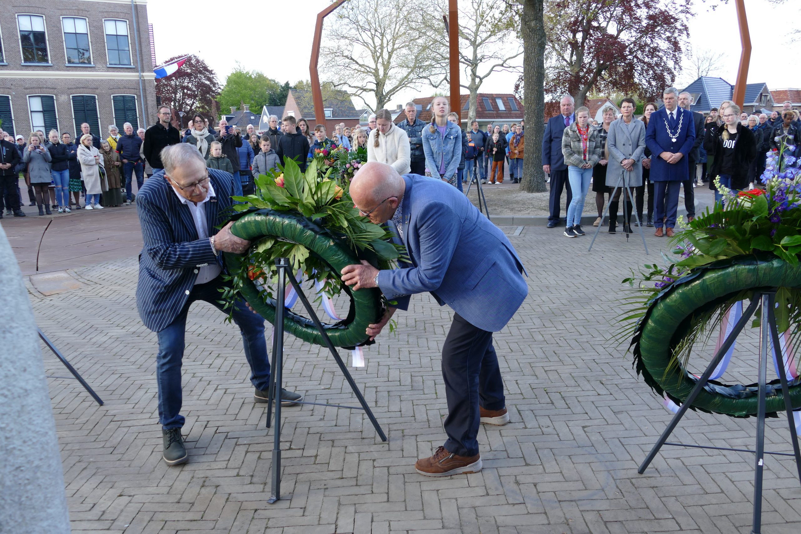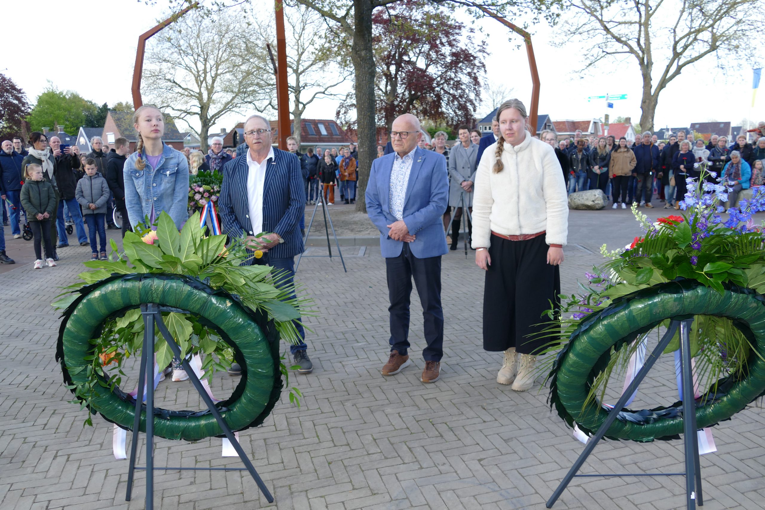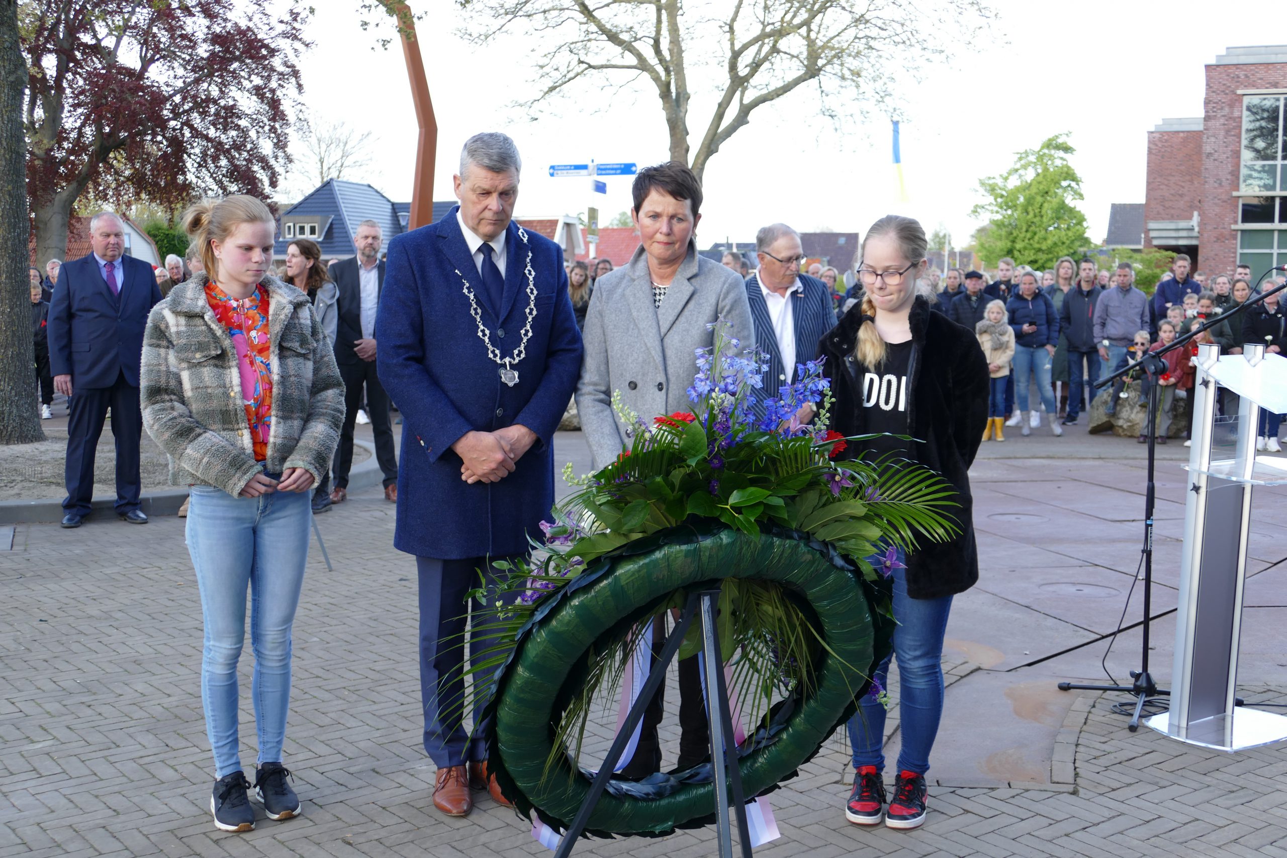 DAMWÂLD – Namens het gemeentebestuur van Dantumadiel werd woensdag 4 mei door burgemeester Klaas Agricola en zijn partner een krans gelegd. De kransdragers waren Isabella Stienstra en Ramona Veenstra, leerlingen van De Wingerd in Damwâld.