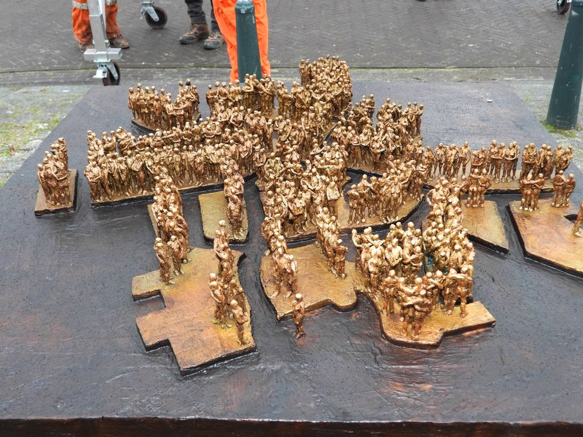 Iedere volwassene, baby, kind, puber en oudere zijn door haar geboetseerd. Het beeld werd na een inzamelingsactie in brons gegoten. De 517 figuurtjes staan op een stalen tafel gemonteerd. “Ik ben heel blij. Het is heel mooi geworden. Het is wel spannend hoe het er uiteindelijk uit komt te zien, maar het komt heel mooi tot z’n recht op deze plek”, zegt de kunstenares terwijl ze instructies geeft hoe het beeld exact moet komen te staan. “De figuurtjes in brons steken mooi af tegen de witte muur van het huis erachter. Als de zon gaat schijnen komen ze nog beter uit.”