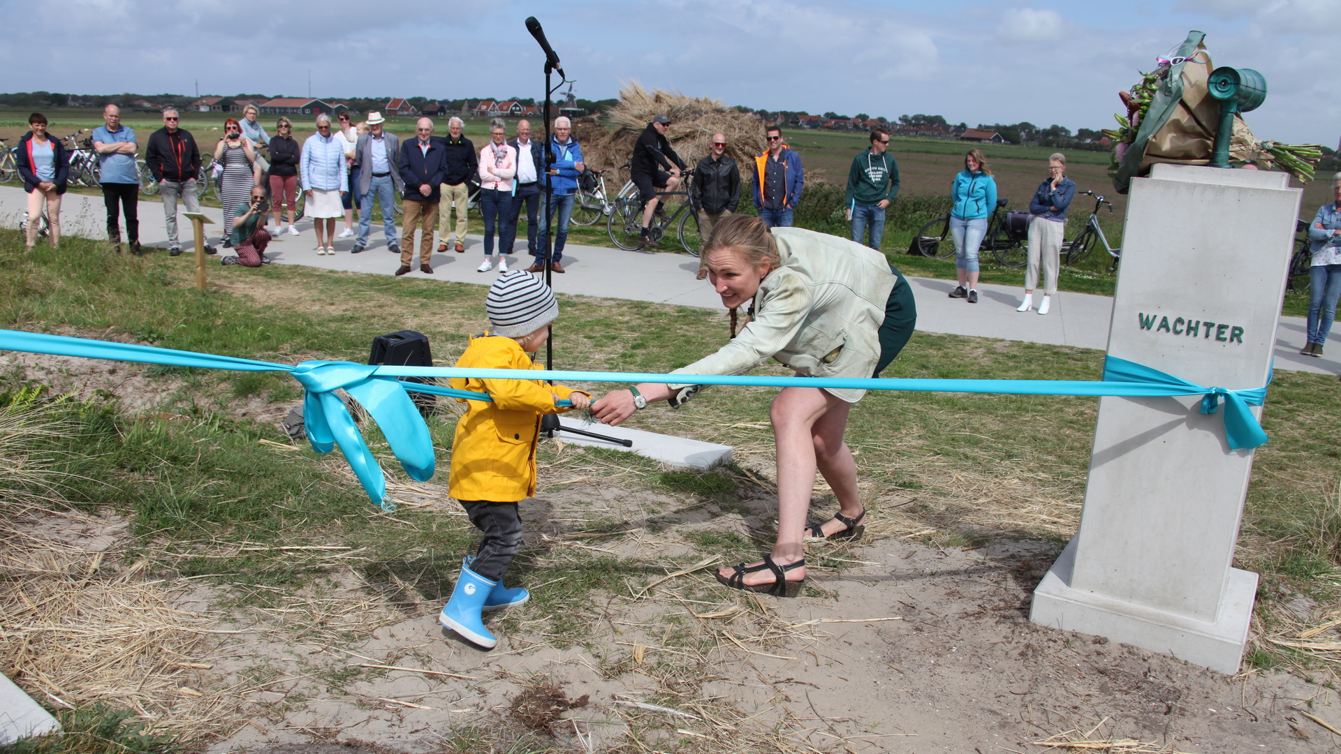 HOLLUM – De tweejarige Ilya Nobel heeft zaterdag 12 juni 2021 het kunstwerk Waker en Wachter onthuld. Hij deed daar door samen met tante Astrid het lint los te trekken dat tussen beide kijkers was gespannen.