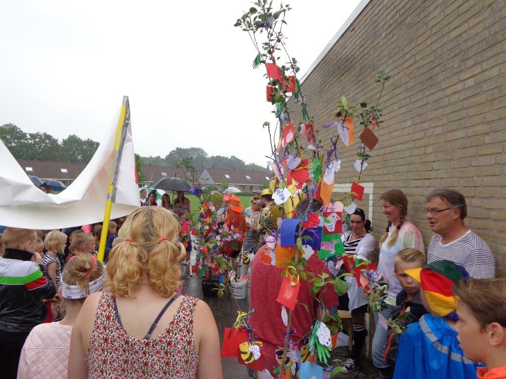 Na te zijn toegezongen door de kinderen, meesters, juffen en vele ouders kregen de juffen elk twee, door de kinderen, versierde fruitbomen als blijvende herinnering aan de school. Het was een mooie afsluiting van een prachtige dag mede door de geweldige inzet van ouders en leerkrachten.