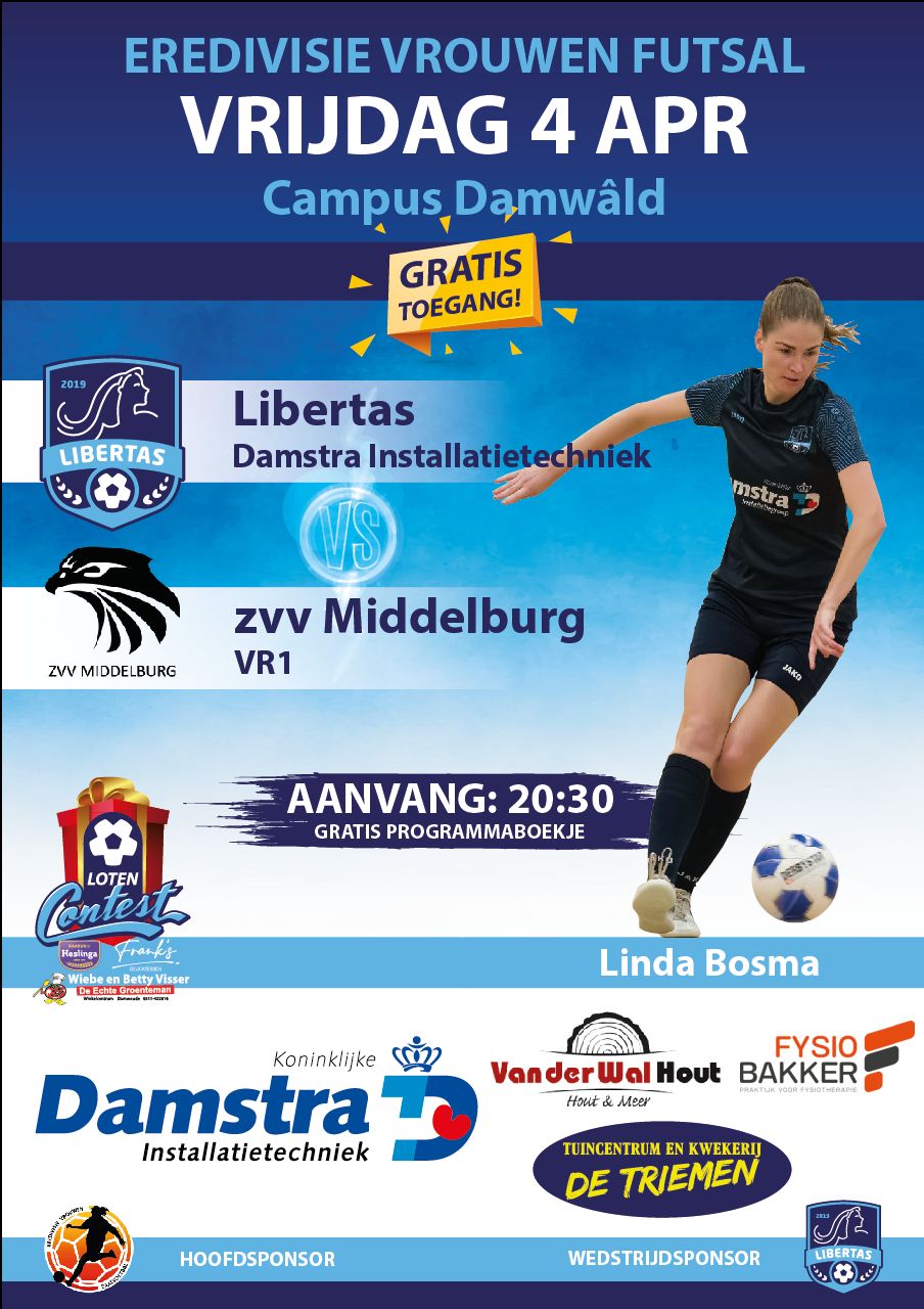 DAMWALD – Nog twee thuiswedstrijden resteren er voor Libertas in de Eredivisie futsal. Om te beginnen vrijdagavond om 20.30 uur in Campus Damwâld tegen Middelburg. Na het spectaculaire gelijkspel tegen Den Haag blijft Libertas koploper in poule B van de Eredivisie Futsal voor vrouwen. Alleen de winnaar van deze poule krijgt nog een kans om mee te dingen naar het landskampioenschap.