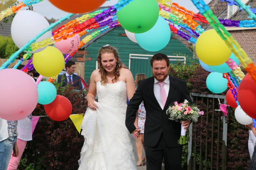 Onder luid gejuich en gezang stapte het bruidspaar onder de ereboog door. De afgelopen weken hebben de kinderen het druk gehad met het instuderen van een mooi lied, speciaal gemaakt voor meester Luit en Maureen. Dit lied hebben de kinderen, de ouders en leerkrachten gezongen op het schoolplein.