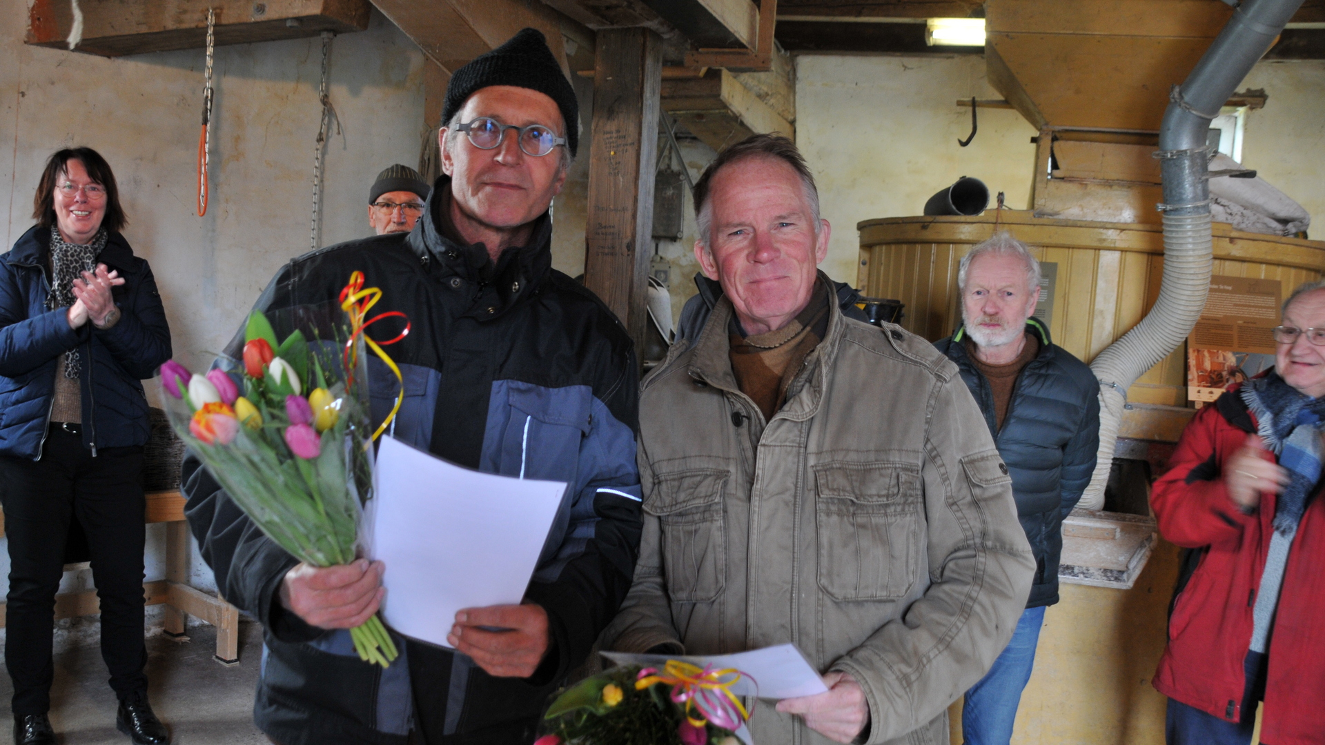 De Stichting Monumentenbehoud Noardeast-Fryslân prijst zich gelukkig dat zij tijdens deze instructieochtend twee nieuwe molenaars kon verwelkomen, die onlangs zijn geslaagd voor hun opleiding bij het Gild Fryske Mounders. Jan van Vulpen uit Oostmahorn en Bate Boschma uit De Westereen volgden hun molenaarsopleiding bij leermeester Sije Hoekstra in Holwerd en Marrum. Jan zal de poldermolen De Gans in Ezumazijl onder zijn hoede nemen en Bate komt de molenaarsploeg van de Zeldenrust in Dokkum versterken. De nieuwe molenaars kregen als welkom door stichtingsvoorzitter Henk van der Veen het molenaarsreglement en een ‘molenaarsdrankje’ overhandigd.