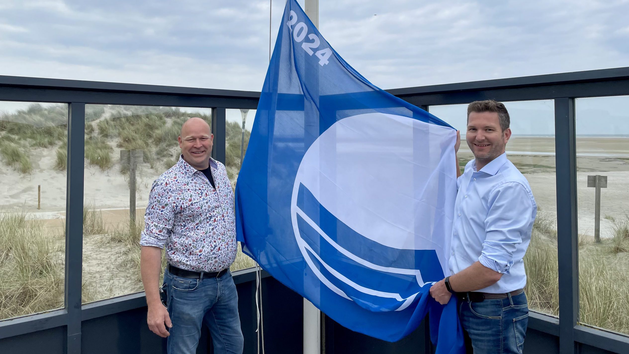 BALLUM – De stranden en jachthaven van Ameland zijn voor de 37e keer op rij bekroond met de Blauwe Vlag, een internationale onderscheiding voor veilige, schone en duurzame locaties. Nieuw dit jaar is dat het strand van Ballum weer is aangemerkt als zwemwaterlocatie en ook de Blauwe Vlag heeft ontvangen. Wethouder Theo Faber overhandigde de Blauwe Vlag aan Fabian Kock, voorzitter van Dorpsbelang Ballum. “Dit is een opsteker voor Ballum en daarmee ook voor Ameland. Heel mooi dat bewoners zich, onder andere via Vrienden van Strand Ballum en het Dorpsbelang, zo hebben ingezet om de blauwe vlag weer terug te krijgen,” aldus Faber.