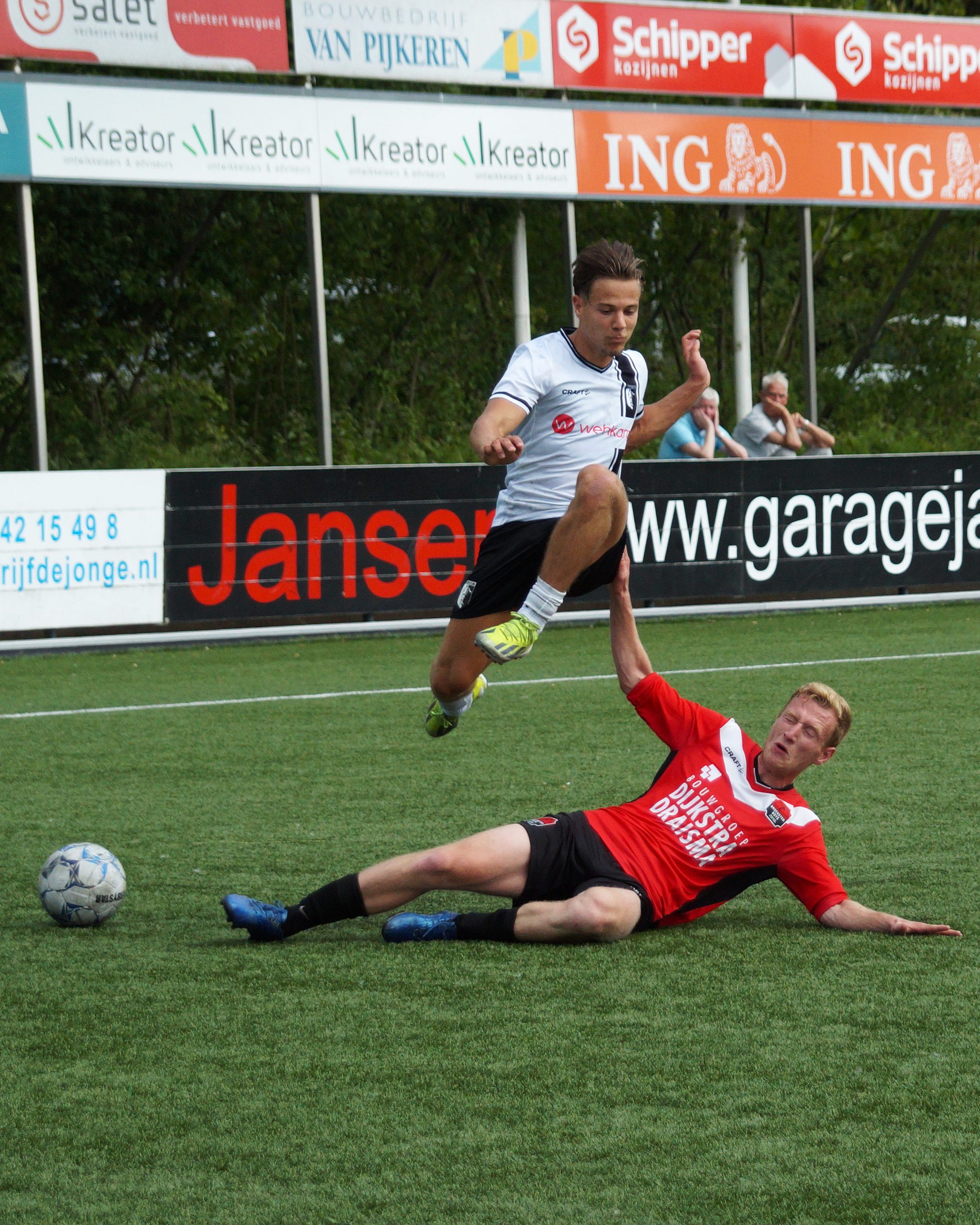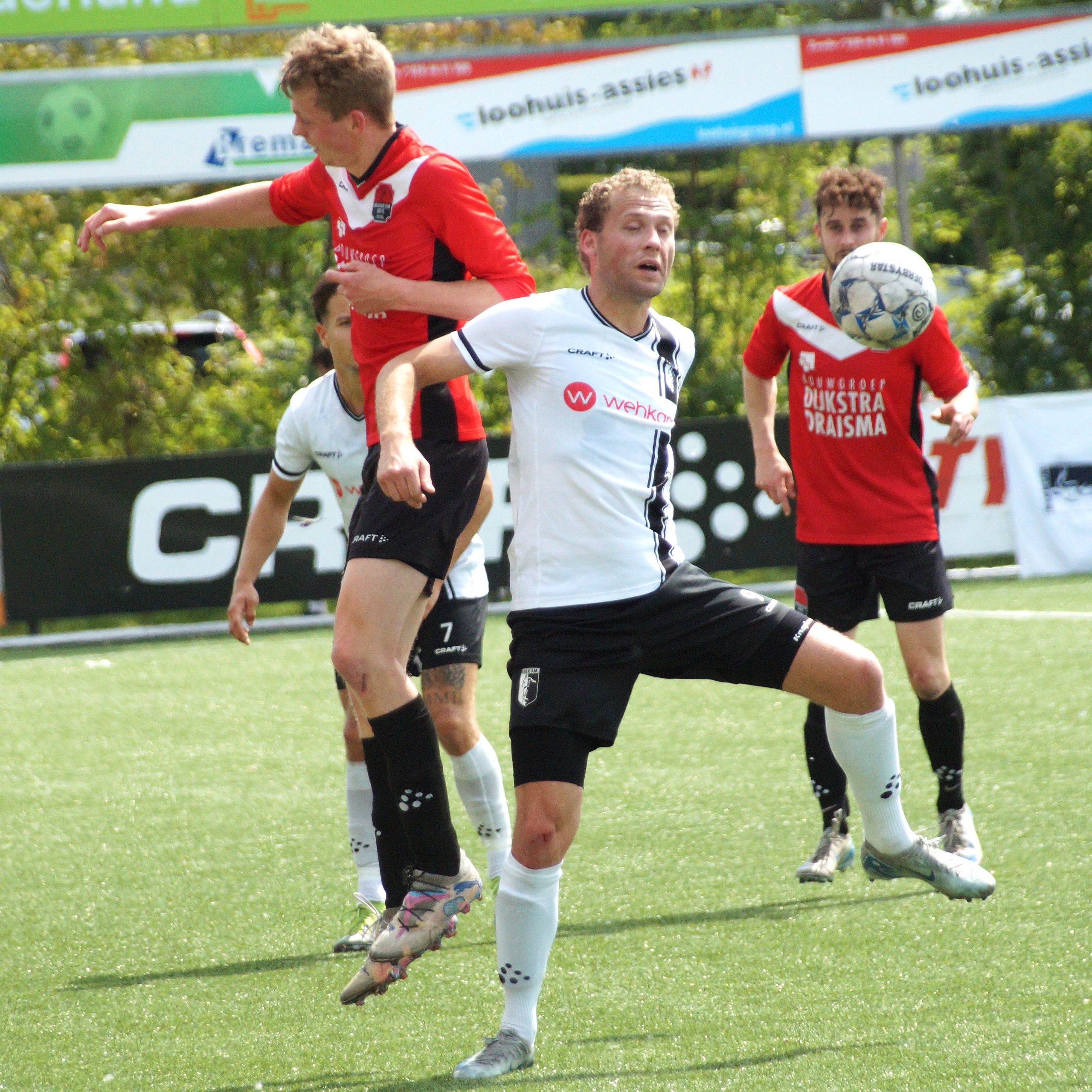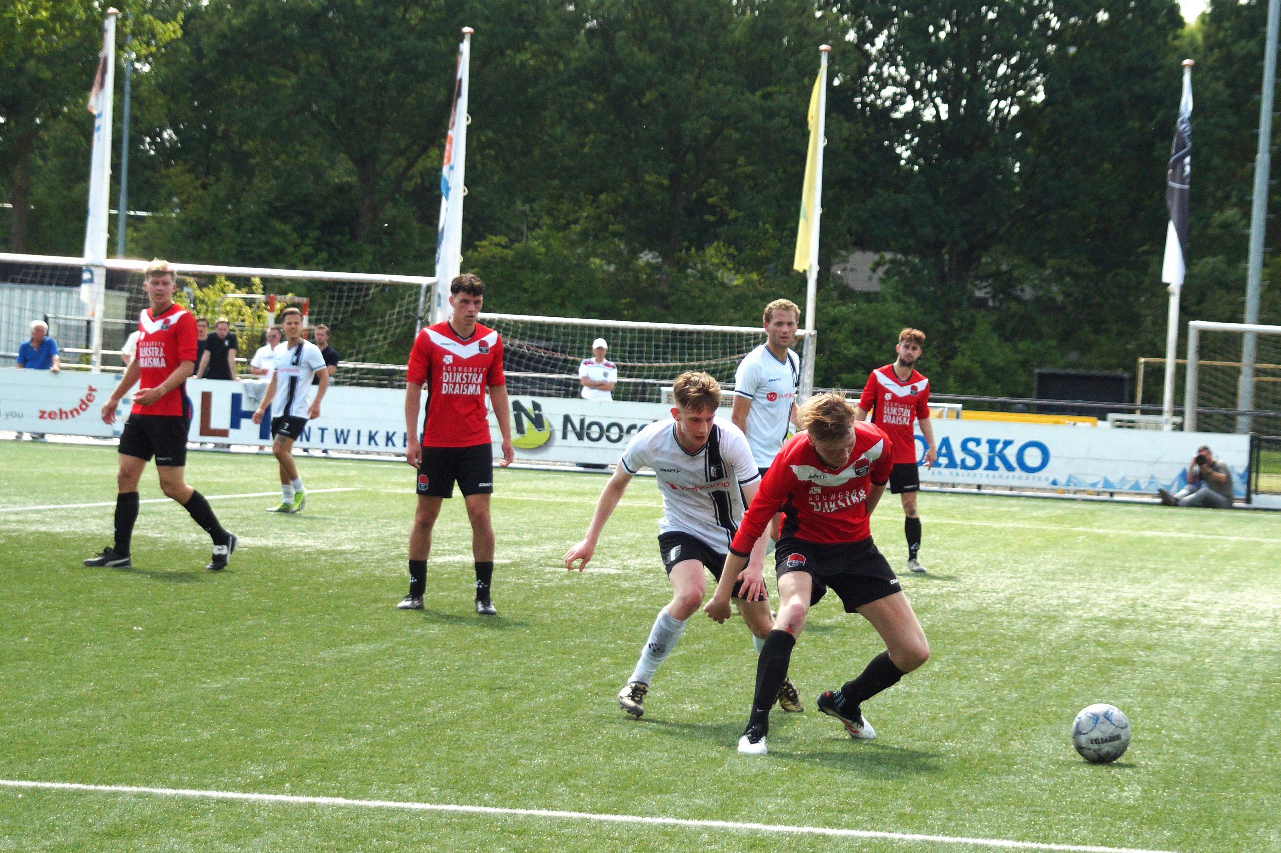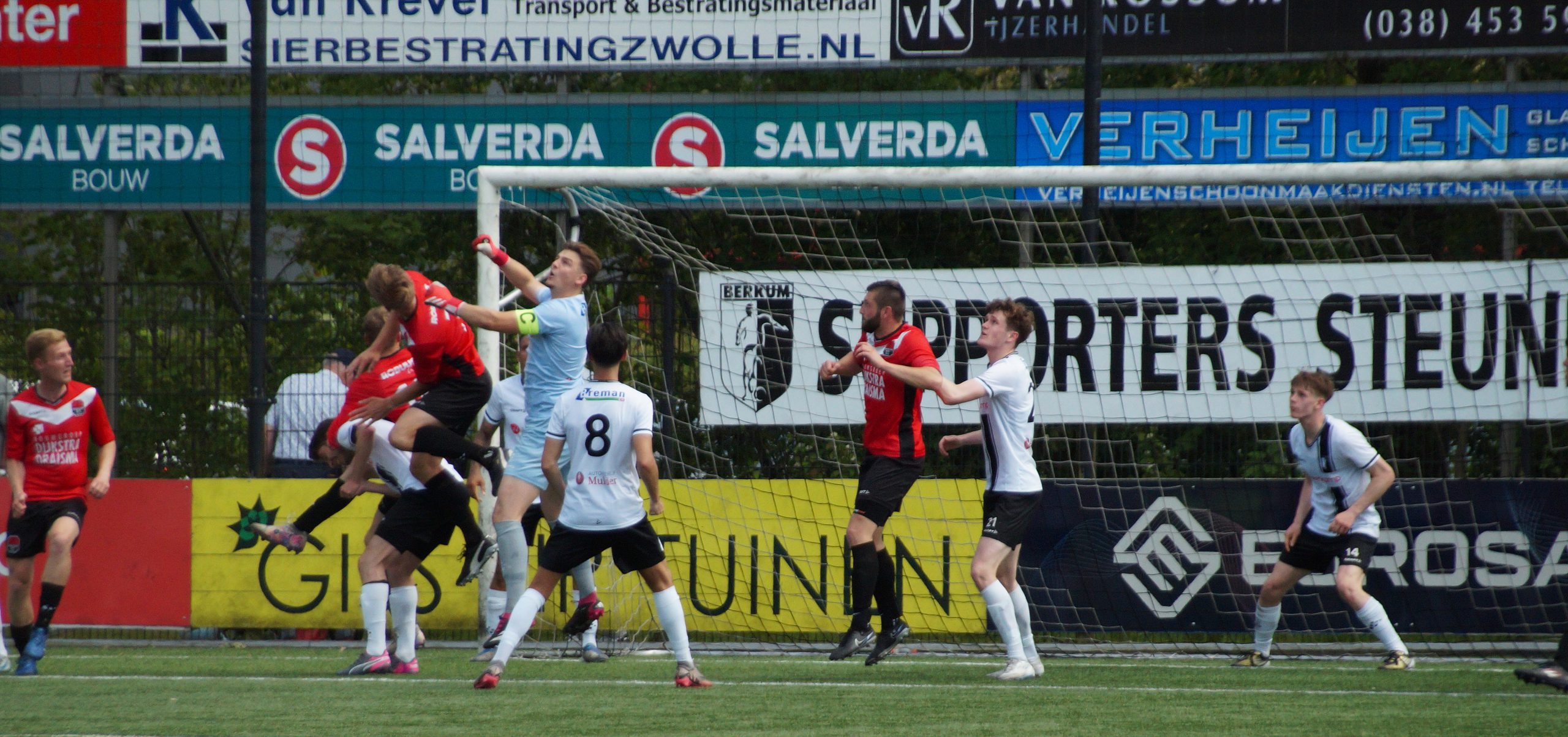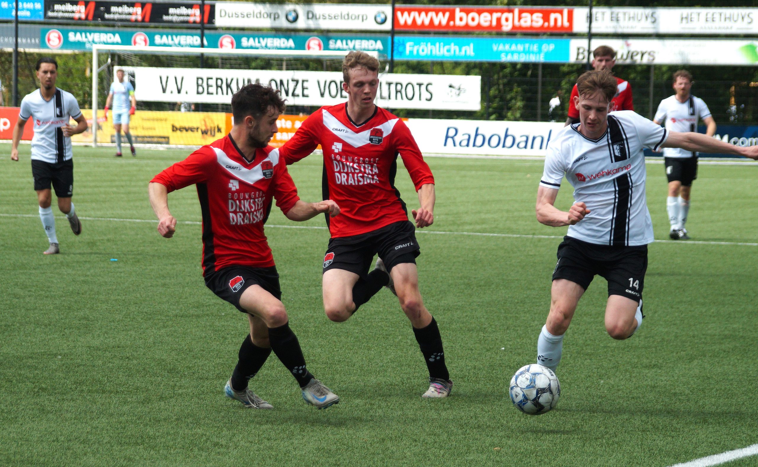 Na een prima aanval over meerdere schijven bracht hij met een knap schot de ploegen weer op gelijke hoogte. Hedgar Hoekstra had 10 minuten later zelfs de voorsprong op zijn schoen. Helaas trof de bal geen doel maar het schoot de snelle vleugelspits wel in zijn rug en moest hij zich helaas laten vervangen. Berkum speelde een prima partij en liet wederom zien uitstekende spelers in hun team te hebben. De gevaarlijkste man was zondermeer Vince van den Anker. De linkervleugelspit is razendsnel en gaat volgens goed ingelichte bronnen de overstap maken naar een ploeg in de tweede divisie. Diep respect voor Niels Westerlaan die het gevaar van v.d. Anker moest elimineren. Wat een meters heeft die man gelopen in de warmte en knap dat hij dit de hele wedstrijd vol wist te houden. Berkum verzuimde door te drukken en Broekster boys haalde snakkend naar adem vanwege de grote inspanning en temperaturen met 1-1 de rust.