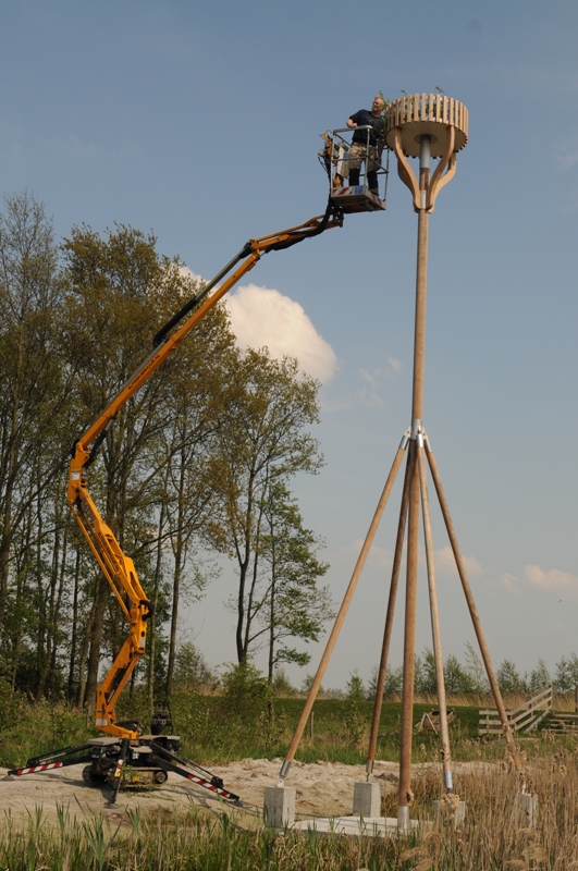 Er werd een mini hoogwerker door Douwe Alting uit Kollumerzwaag geschikbaar gesteld zodat het nest alvast een beetje “aangekleed” kon worden. Vanaf de fietspaden langs de Zwemmer en de Valomstervaart is het nest zeer goed te zien. Hopelijk kunnen de ooievaars de verleiding niet lang weerstaan en kunnen de Westereenders en campinggasten binnenkort genieten van een gelukkig ooievaarspaartje. Hulde aan Doarpsbelang van De Westereen voor het realiseren van dit bijzonder fraaie ooievaarsnest.