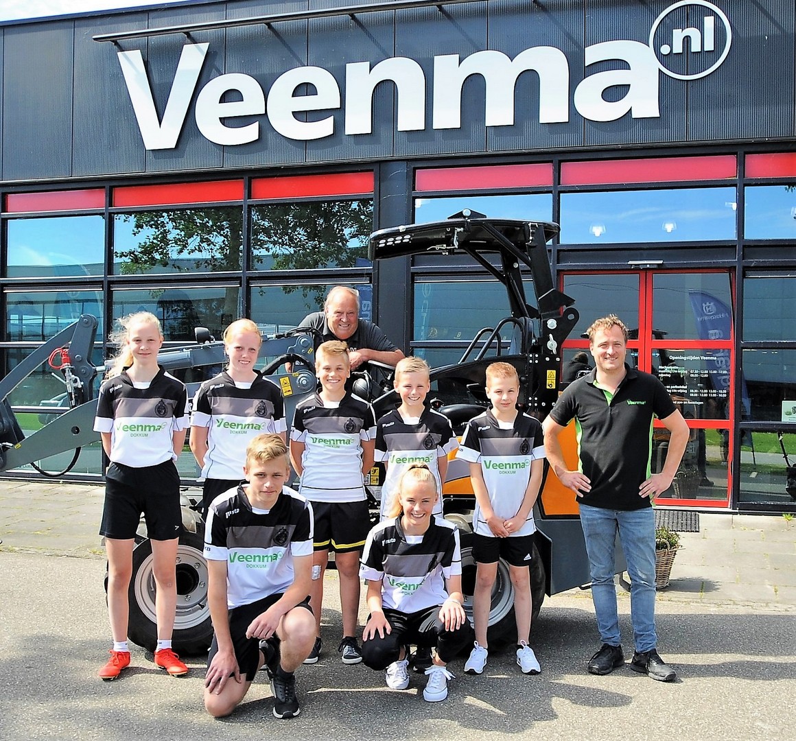 Veenma werd wederom bereidt gevonden om hun naam aan deze shirts te verbinden zodat de jeugd er weer keurig bij loopt. Op de foto staan een aantal jeugdleden en de sponsoren Feitze en Gosse Veenma.
