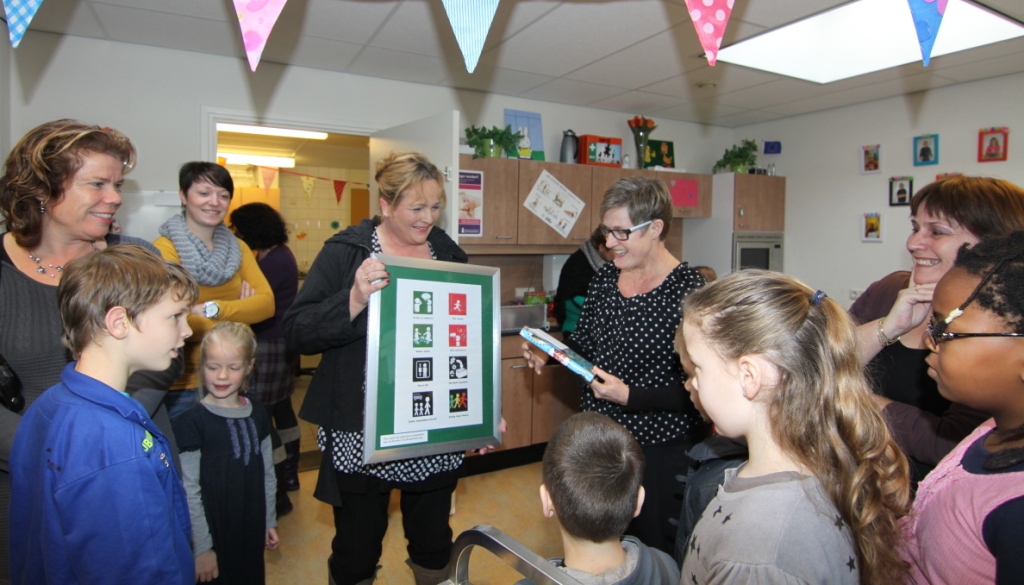 Directeur Sietske Leen bood namens de bewoners mooi ingelijste pictogrammen aan die laten zien wat de regels zijn die de kinderen met de bewoners hebben afgesproken. Daarbij ook nog een kinderboek over de 4 seizoenen die ook in ieders leven plaats vinden.