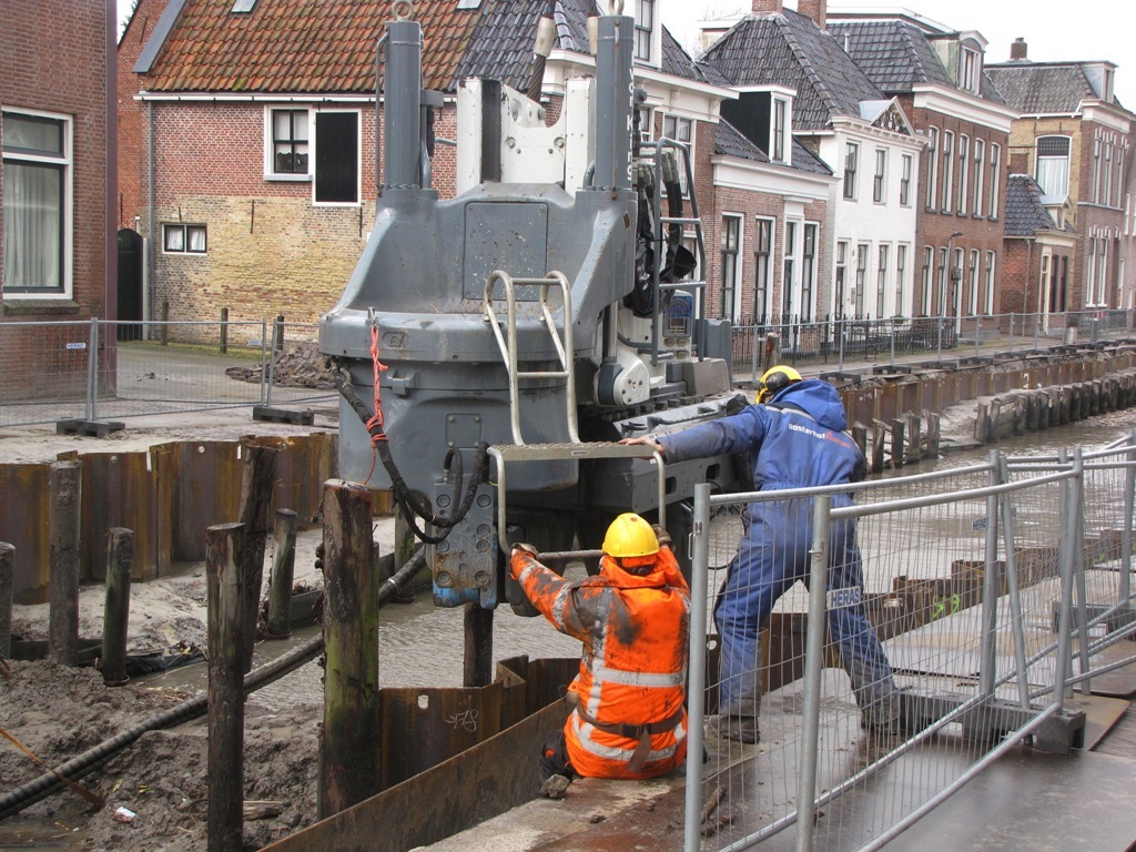 De machine die de damwanden drukt is ook verplaatst door kraanverhuur Kielstra van de Westerdiepswal naar de Oosterdiepswal waar de laatste nog 12 meter nog in de grond moet worden gedrukt.
