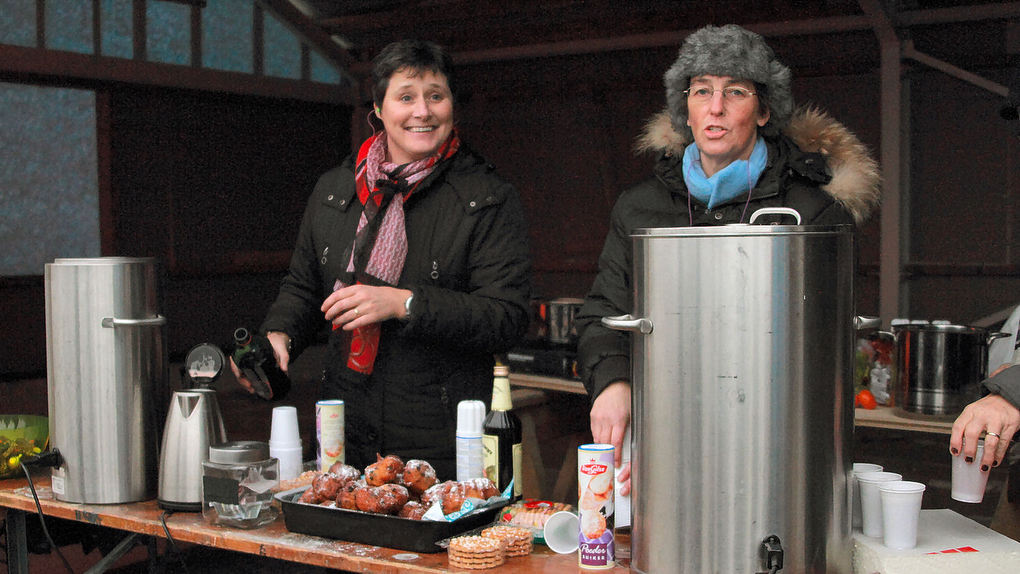 Ook op Ameland werd 2012 uit geluid met hevige knallen met carbidbussen, op de foto’s aan het Vrijewil pad in Buren. De dames verzorgden de carbidschieters en het aanwezige publiek van koffie en glühwein en oliebollen.