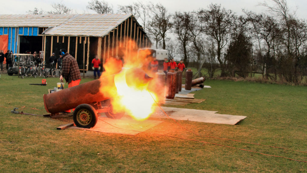 Ook op Ameland werd 2012 uit geluid met hevige knallen met carbidbussen, op de foto’s aan het Vrijewil pad in Buren.