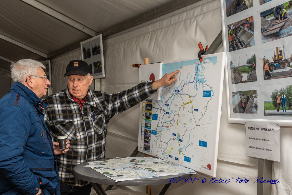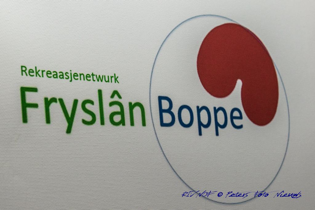 Douwe Streekstra was uitgenodigd om een woordje te doen over de opvaarten. Samen met Jan Prins uit Wierum zijn zij de drijfveer achter het project. De heren zijn al jaren bezig om de vaarten open te krijgen voor boten. Nu Oosternijkerk bevaarbaar is, komt alles weer iets dichter bij. Jan Prins verteld enthousiast over deze missie, als een ieder wat mee werkt gaat het goed komen. Aan de muur in de tent hingen tekeningen en kaarten van de opvaarten. Maar ook het logo ‘’Rekreaasjenetwurk Fryslân Boppe’’ Het Pompeblêd, zo typisch Fries, was over de kop gezet in het logo om de regio Noard East Fryslân te symboliseren.