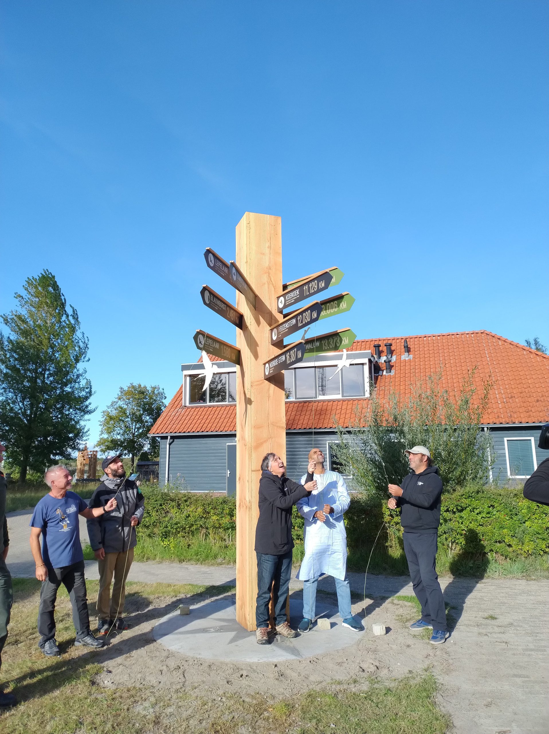 LAUWERSOOG – Bij het Activiteitencentrum Lauwersnest in Lauwersoog is donderdagmiddag een bijzondere bewegwijzeringspaal onthuld. De paal is 4,40 meter hoog en wijst bezoekers waar andere, voor trekvogels belangrijke, nationale parken in andere landen zich bevinden.