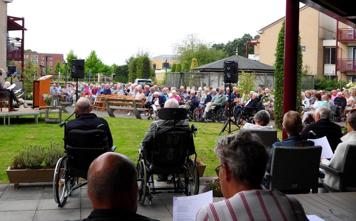 Omdat veel van de activiteiten in het verzorgingstehuis stilliggen door de zomerperiode, besloot de gemeente op bezoek te gaan en hielden zij samen met de bewoners en belangstellenden een openluchtdienst. Na afloop van de dienst was er gelegenheid om nog even na te praten onder het genot van een kopje koffie of thee. Voor de kinderen was er limonade.