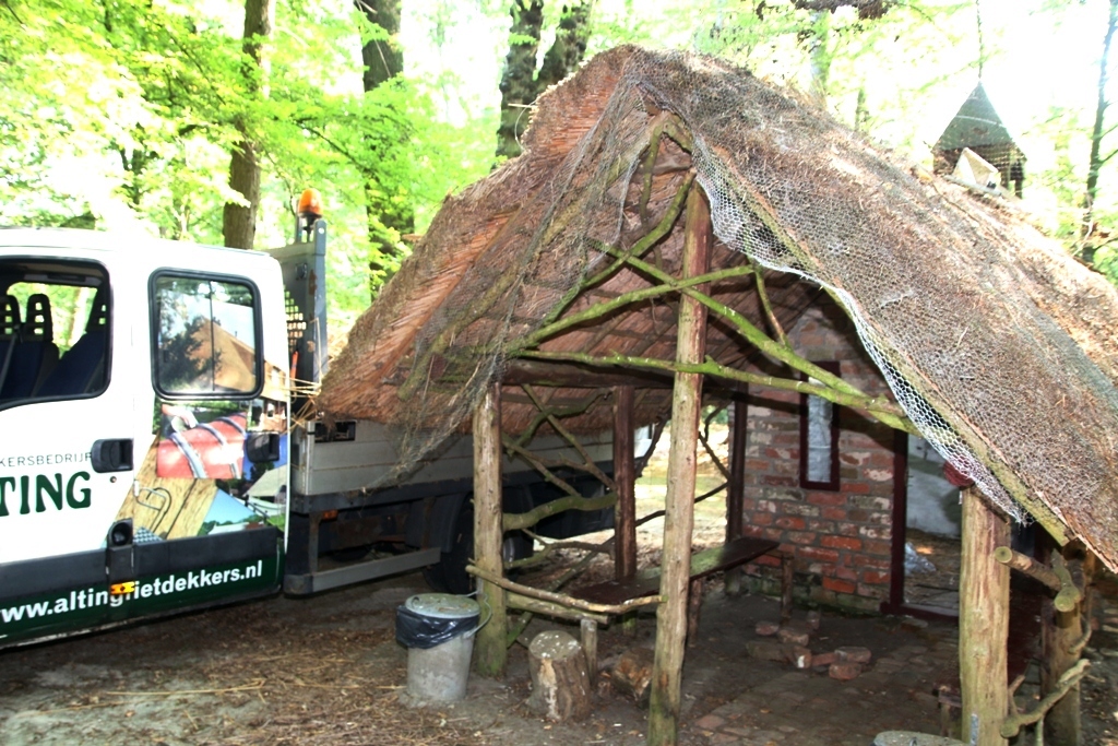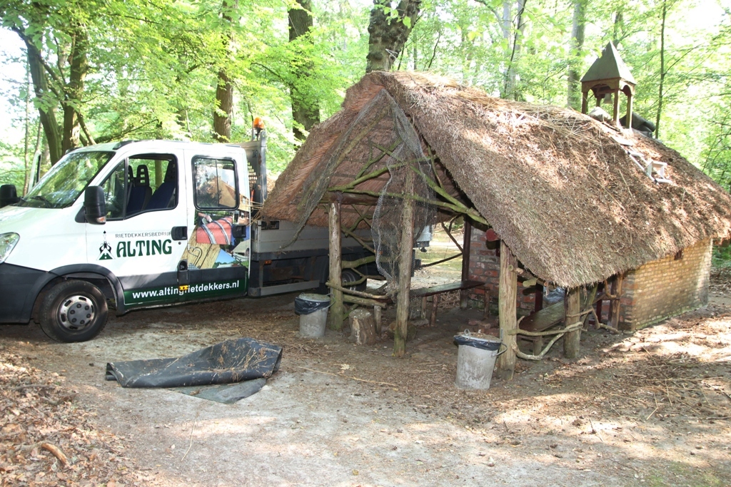 Dinsdagmorgen ging rietdekkersbedrijf Alting in Veenklooster van start met een bijzondere klus. Zelf noemen ze het hun kleinste project van dit jaar. Het opnieuw van riet voorzien van het heremiet-huisje in het bos van Veenklooster. Het bouwwerk is eigendom van Kyra Livia baronesse van Harinxma thoe Slooten.
