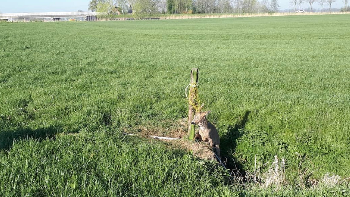 Een man die op de Zwemmer aan het kanoën was zag dat, het dier verstrikt was geraakt in het schrikdraad. De politie heeft het beestje losgemaakt, waarna het heel blij de vrijheid tegemoet rende.