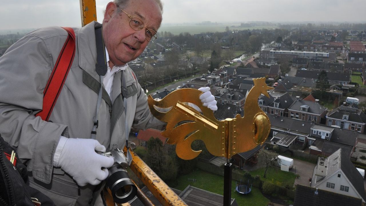 Oud dominee Jan van Buuren uit Kollum heeft donderdagmorgen de nieuw vergulde winhaan terug gezet op de spits van de Oosterkerk in Kollum. Hij kreeg daarbij…