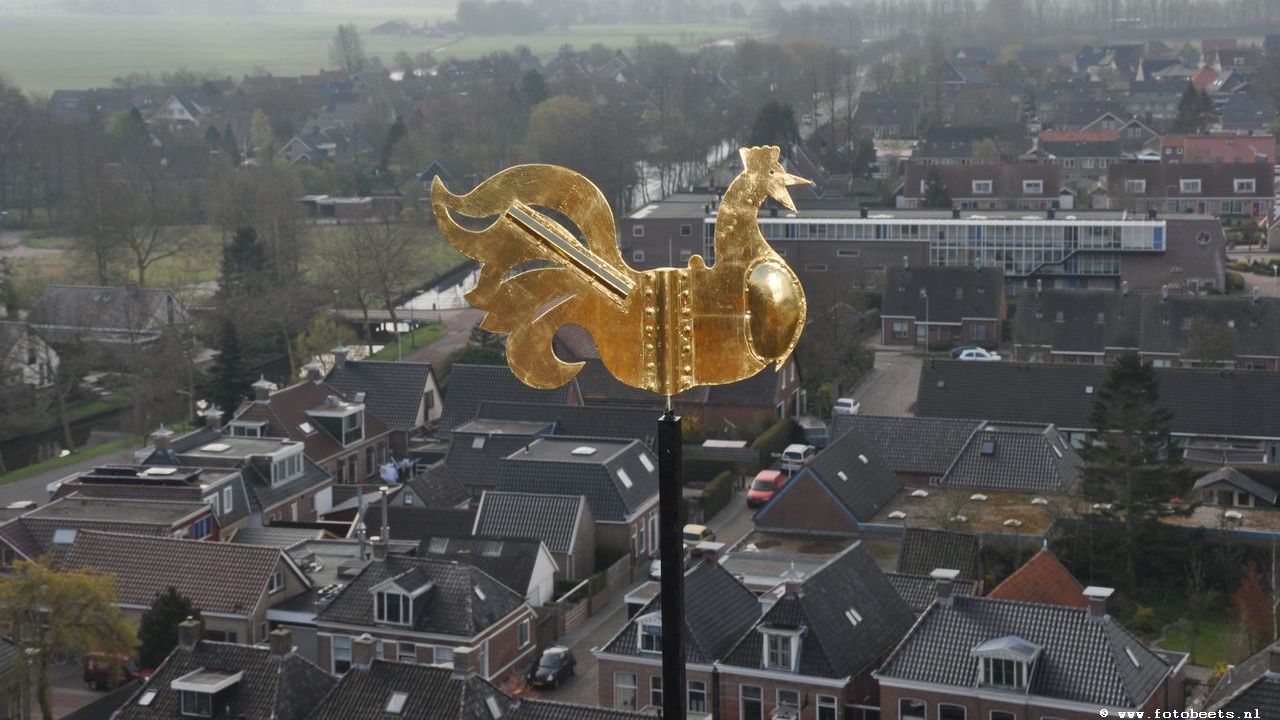 Oud dominee Jan van Buuren uit Kollum heeft donderdagmorgen de nieuw vergulde windhaan terug gezet op de spits van de Oosterkerk in Kollum. Hij kreeg daarbij hulp van dakwerker Robert Schiltz. Vanuit een bakje aan een telescoopkraan werd de haan na een afwezigheid van twee weken geplaatst op eenzame hoogte.