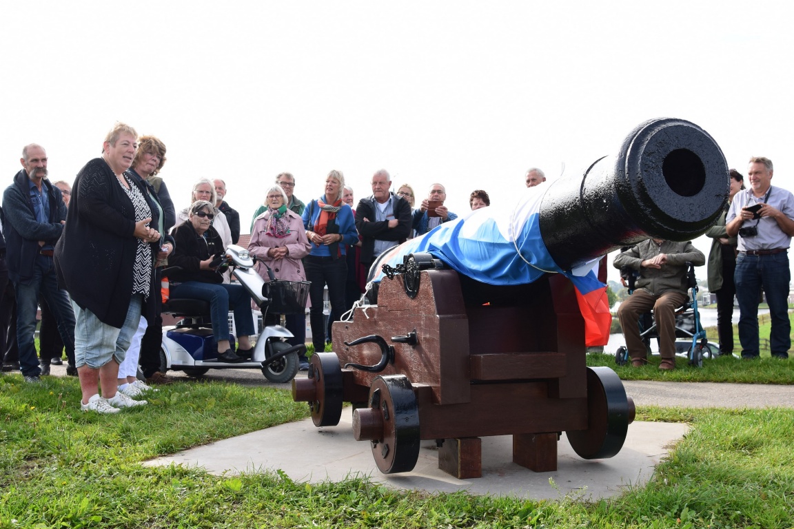 Na dit moment werden de aanwezigen naar het oude kanon gedirigeerd, begeleid met muziek van piratenkoor ‘Smokkelaars van de schans’. De loop die jarenlang op de gemeentewerf in Dokkum lag is na een schoonmaak en verfbuurt naar het Friesland college gebracht, hier werd de loop van een nieuw affuit voorzien. De vondst op de werf bracht nog een loop tevoorschijn. ‘Die loop wordt eveneens voorzien van een affuit en krijgt een plekje in Dokkum nabij de Halvemaanspoort’. Aldus Wethouder de Graaf die na haar woord het kanon onthulde. ‘Naast Dokkum is nu ook Oostmahorn beschermt tegen rovers en ander gespuis dat over het water onze gemeente wil innemen’ De loop is gemerkt met het jaartal 1812 en het is dus goed mogelijk dat deze loop hier echt heeft gestaan aldus enkele aanwezigen.