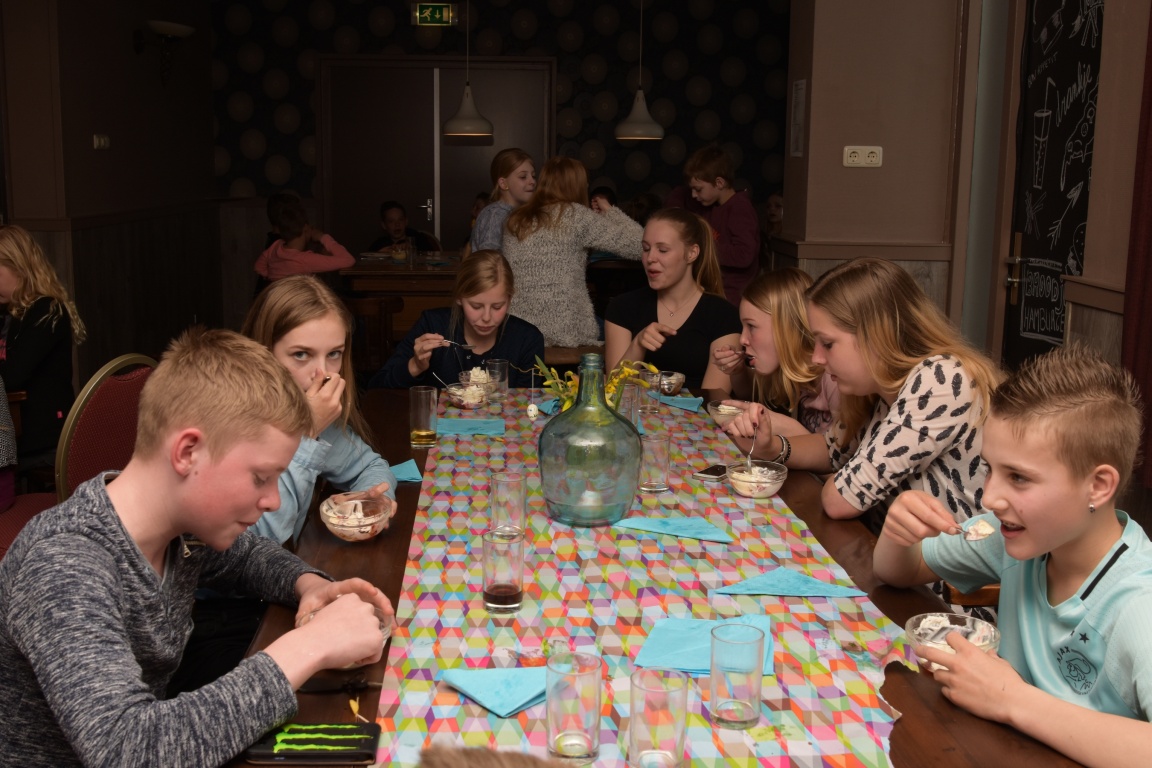 De bijna 40 jongeren kregen in het mooi aangeklede bargedeelte van dorpshuis Tunawerth, een buffet voorgeschoteld bestaande uit: broodjes hamburger speciaal, patat, 3 soorten zelf bereide pizza en 3 soorten lasagne. De maaltijd werd afgesloten met een heerlijk ijsdessert. Het was een geslaagd samenzijn wat misschien wel weer een vervolg krijgt.