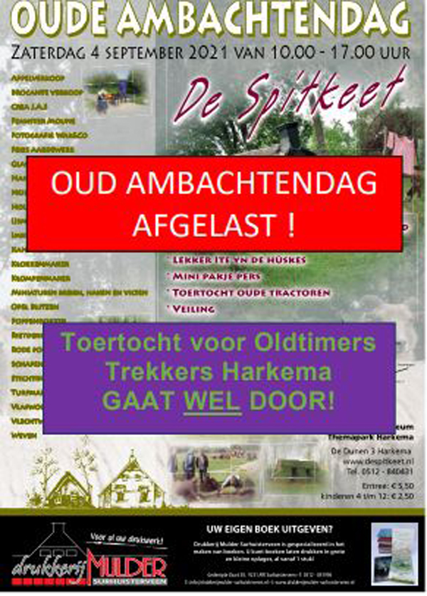 HARKEMA – Helaas heeft de organisatie moeten besluiten dat de Oude Ambachtendag op zaterdag 4 september a.s. bij Openluchtmuseum De Spitkeet in Harkema niet doorgaat.
