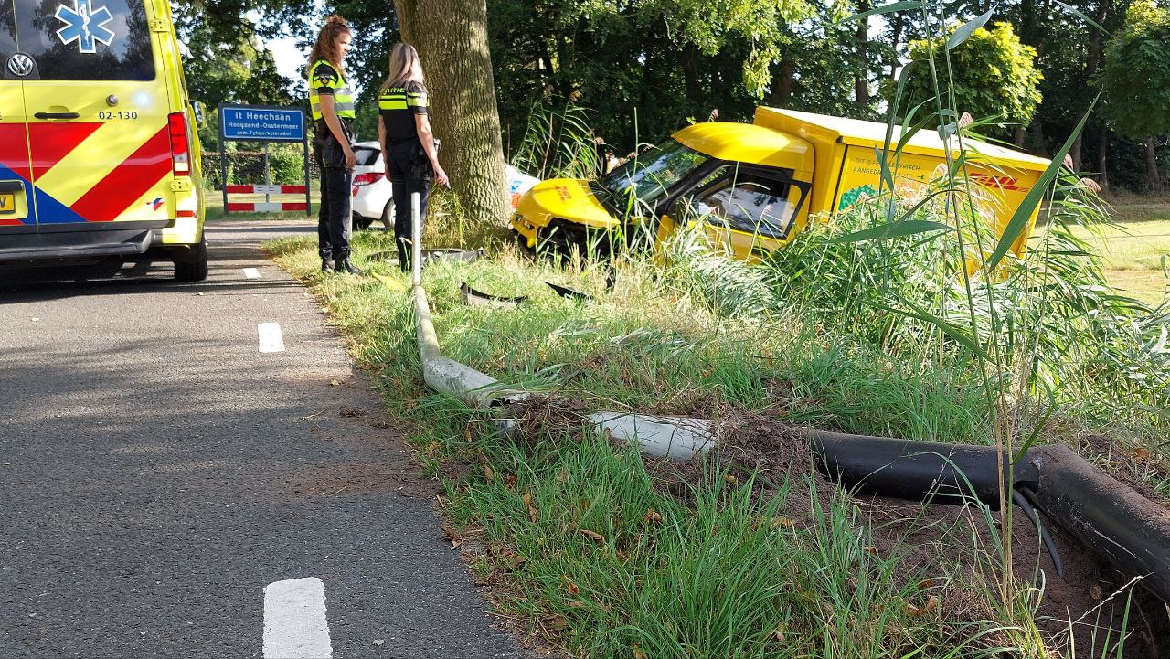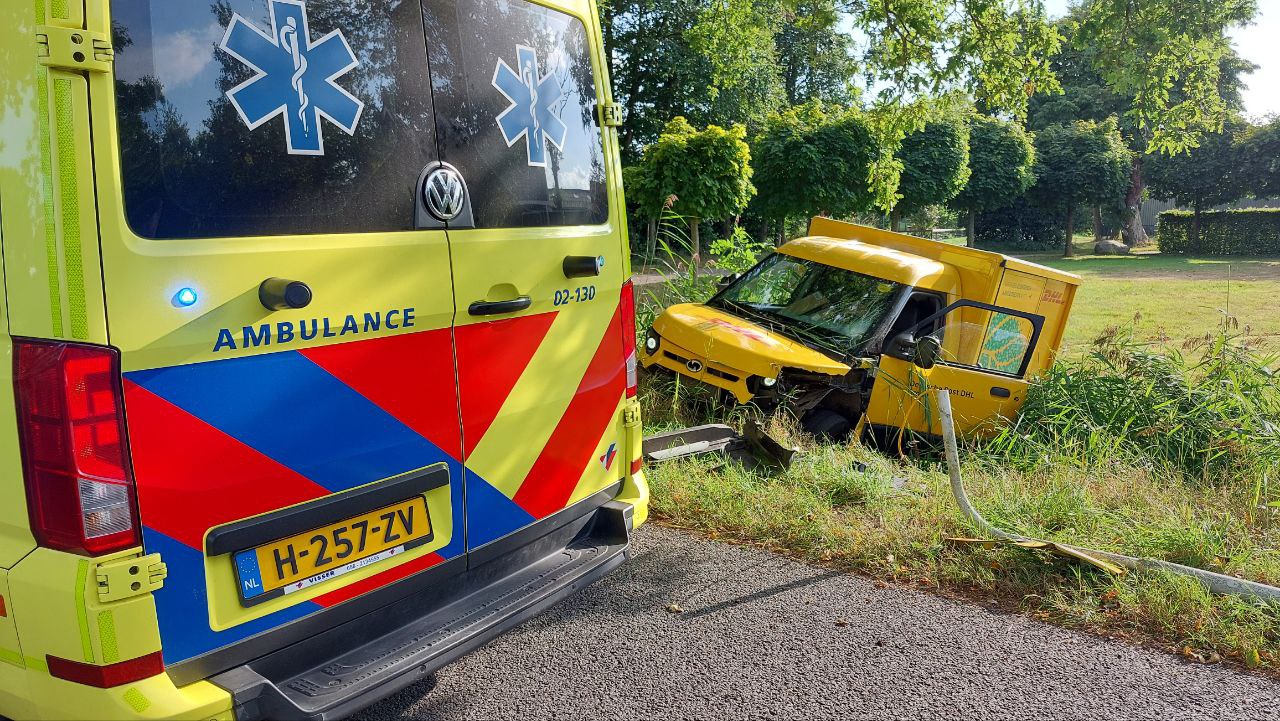 Het elektrische voertuig kwam door nog onbekende oorzaak via een lantaarnpaal en een boom in een droge sloot tot stilstand. De bestuurster is na controle door het ambulancepersoneel met onbekend letsel overgebracht naar het ziekenhuis. De pakketjes zijn overgeladen in een ander busje van DHL. Een bergingsbedrijf heeft het voertuig afgesleept.