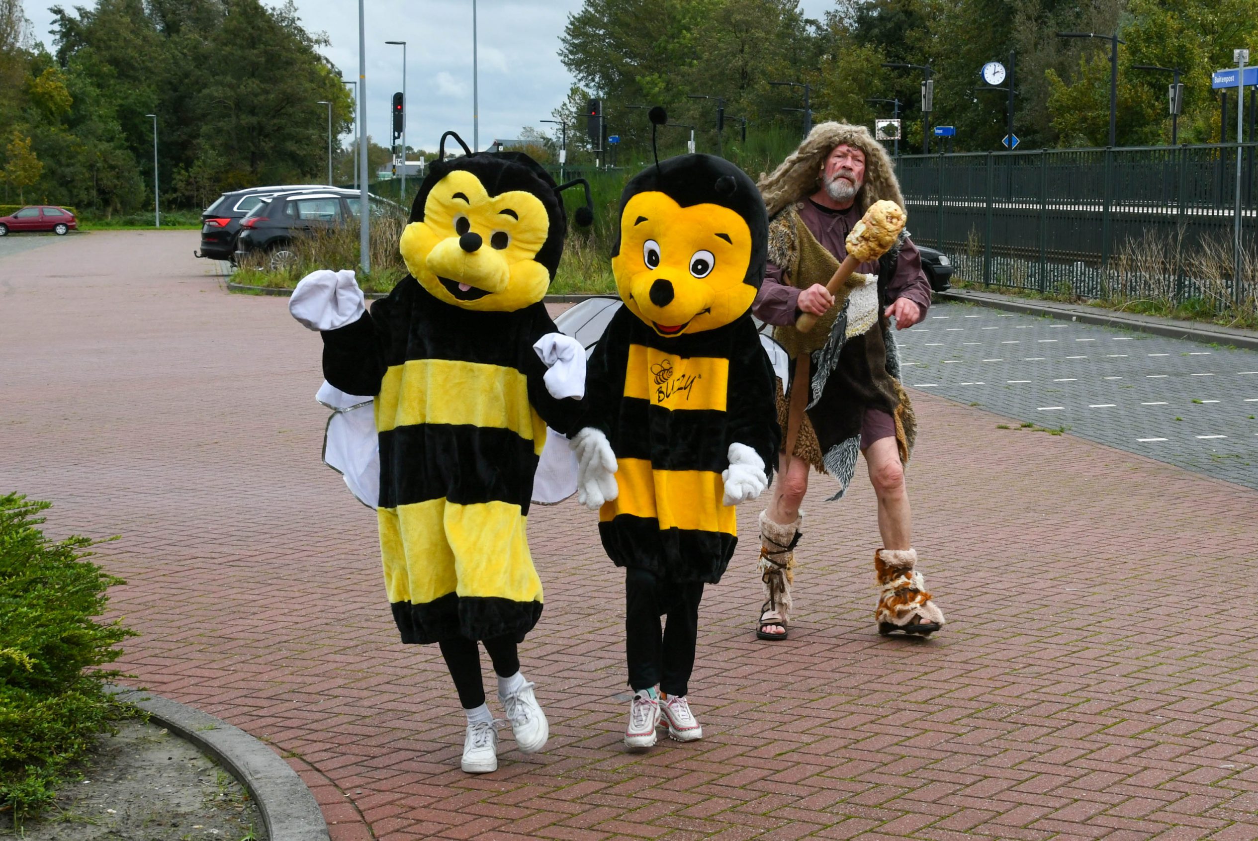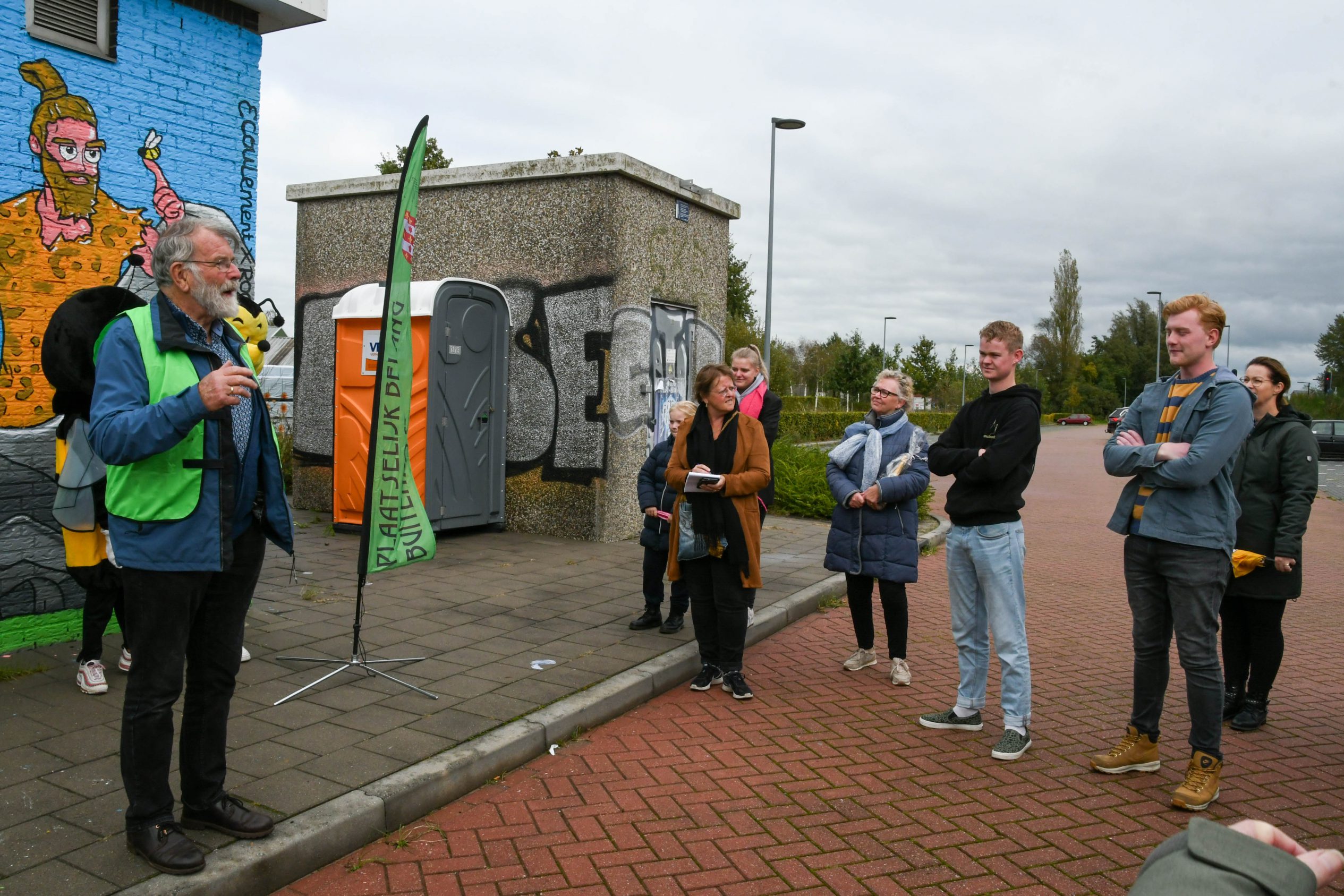 BUITENPOST – Zaterdagmiddag 21 oktober werd de fraaie beschildering, uitgevoerd door Cor Pompstra en Harry Rocksma, van het gebouw aan de noordzijde van het treinstation in Buitenpost officieel geopend. Na een welkomstwoord door de voorzitter van Plaatselijk Belang, Theo Bakker, kwam “een neanderthaler vergezeld van twee bijen” van de Kruidhof aangelopen. Zij gingen met de drie gieters, die al klaar stonden, de bloemen nog één keer water geven, door symbolisch de laatste hand aan het kunstwerk te geven en dat het kunstwerk een lang leven beschoren mag zijn.