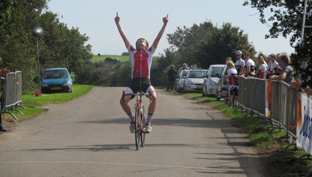“Helaas konden we niet meer dan maximaal 15 seconden afstand nemen. Na het half uur werden we opgeslokt door het peloton”, vertelde Pieter na afloop. De junior uit Gerkesklooster liet het daar echter niet bij zitten en probeerde het in de slotfase van de koers nogmaals. “Drie ronden voor het einde ontsnapte ik opnieuw uit het peloton. Rick en Melle stopten keurig af en zo lukte het me om voorop te blijven. Ik kwam solo over de streep en mocht op het podium de Pompeblêdentrui in ontvangst nemen”, aldus de winnaar na afloop. Met deze Pompeblêdentrui maakt Pieter zondag zijn opwachting in Blauwhuis.