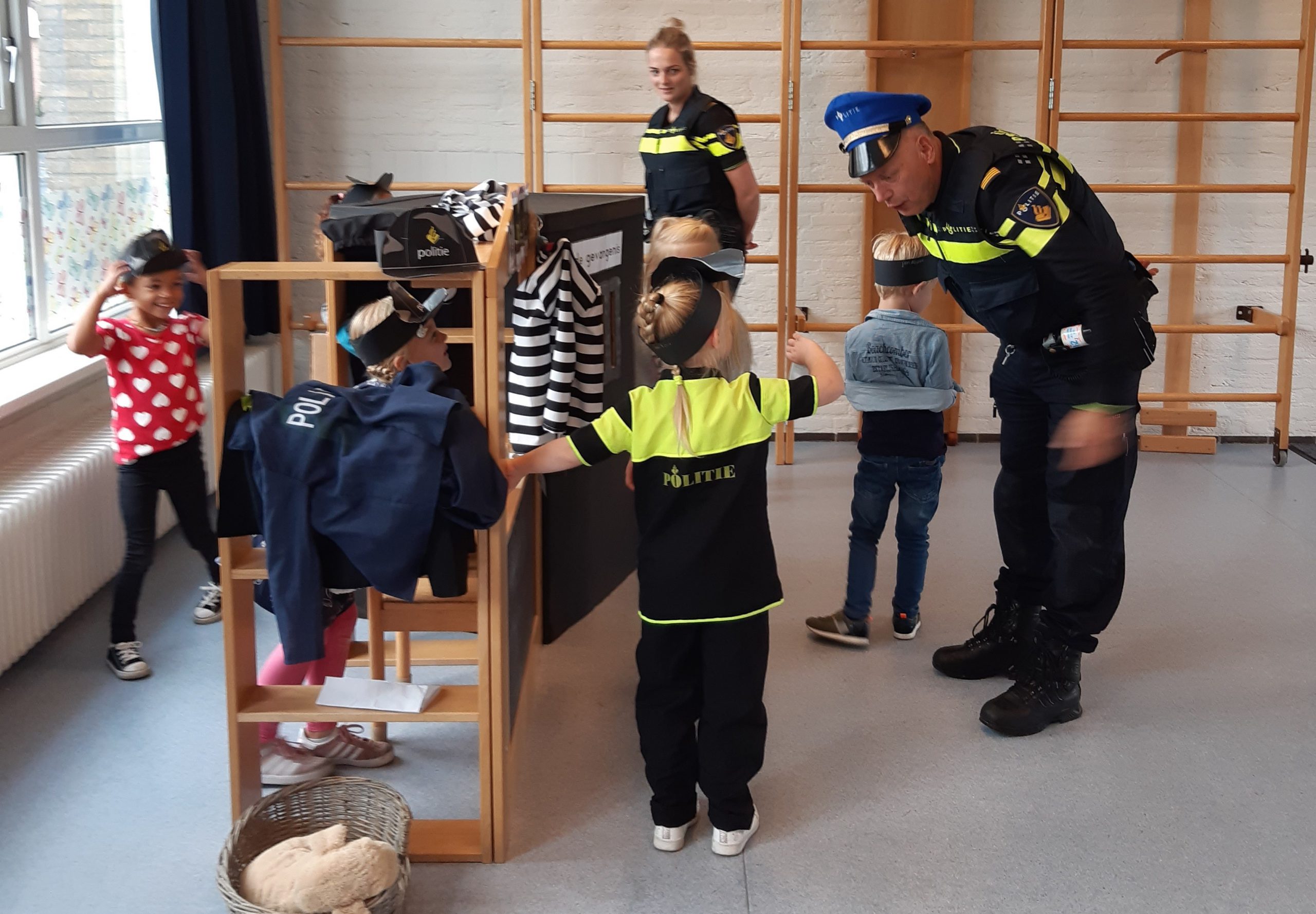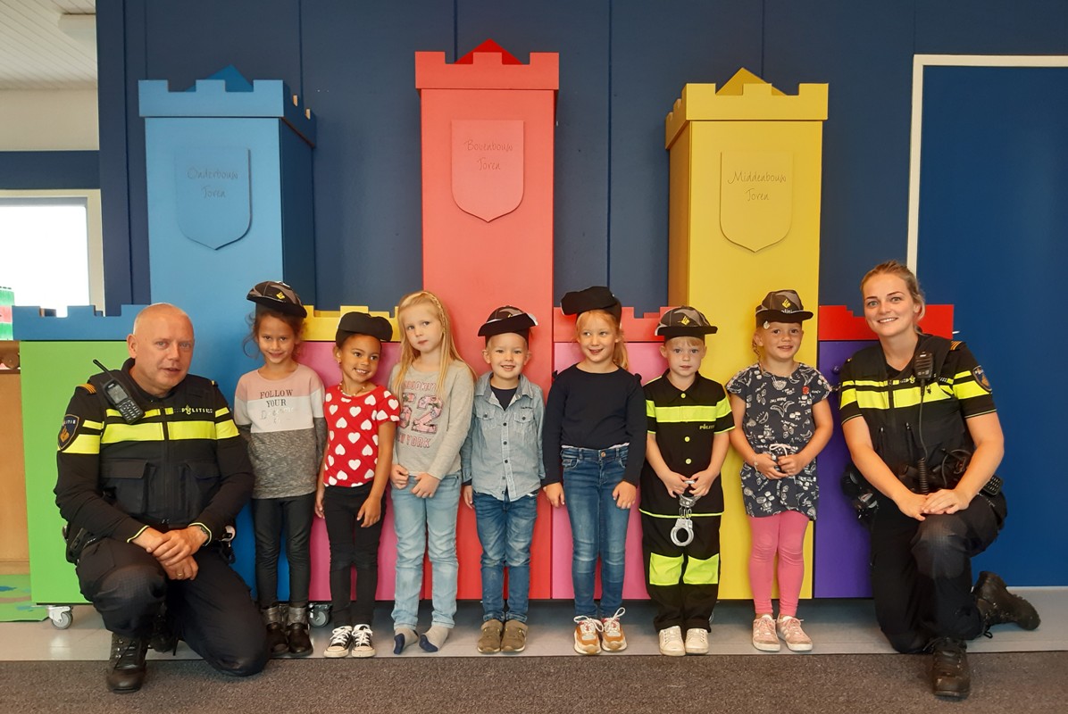 De kinderen mochten allerlei vragen stellen en vertelden wat ze allemaal al hadden geleerd over de politie. Zo wisten ze welke voertuigen en dieren de politie gebruikt tijdens hun werk en hoe het uniform eruit ziet. In het speellokaal stond het politiebureau met een gevangenis , waar de kinderen zich konden verkleden als politie en boef. De rollen werden nu even omgedraaid, want nu werden de politieagenten door de kinderen in de boeien geslagen. Daarna was het tijd om nog even met de politie op de foto te gaan. Het was een hele spannende, maar ook leerzame ochtend.
