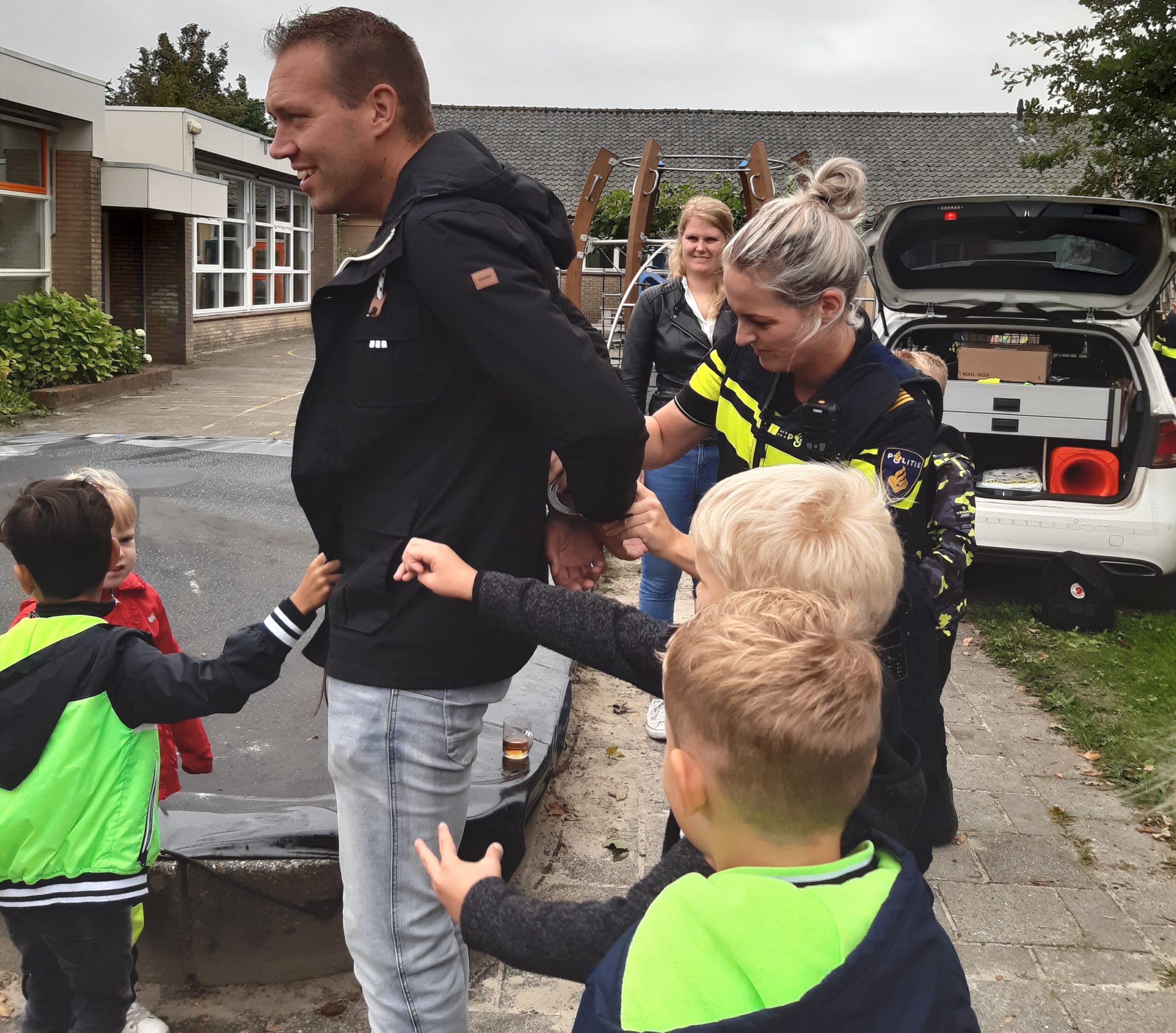 Zelfs de meester en de juffen werden even in de handboeien geslagen en in de politieauto gezet. Gelukkig was het allemaal maar alsof en werden ze snel weer bevrijd. De agenten vertelden van alles over hun dienstwagen en de kinderen mochten ook in de politieauto zitten. De zwaailampen en de sirene werden ook even aangezet. Daarna gingen de agenten nog even mee in de klas van groep 1-2.