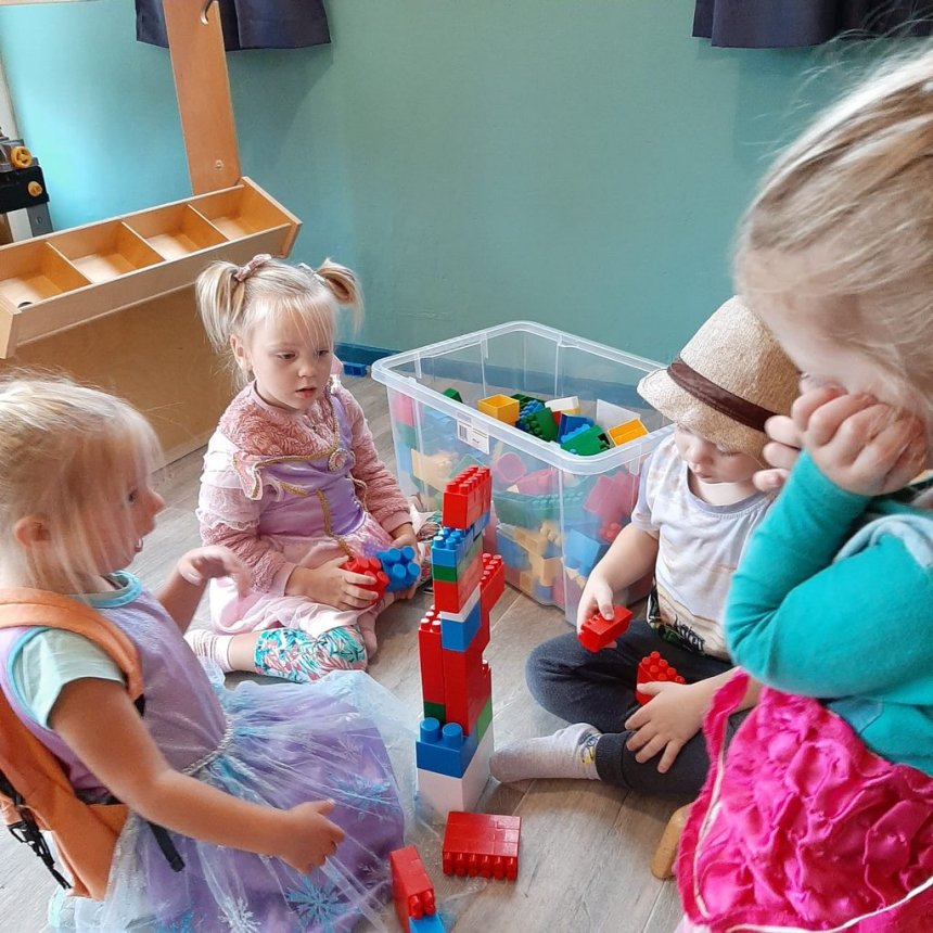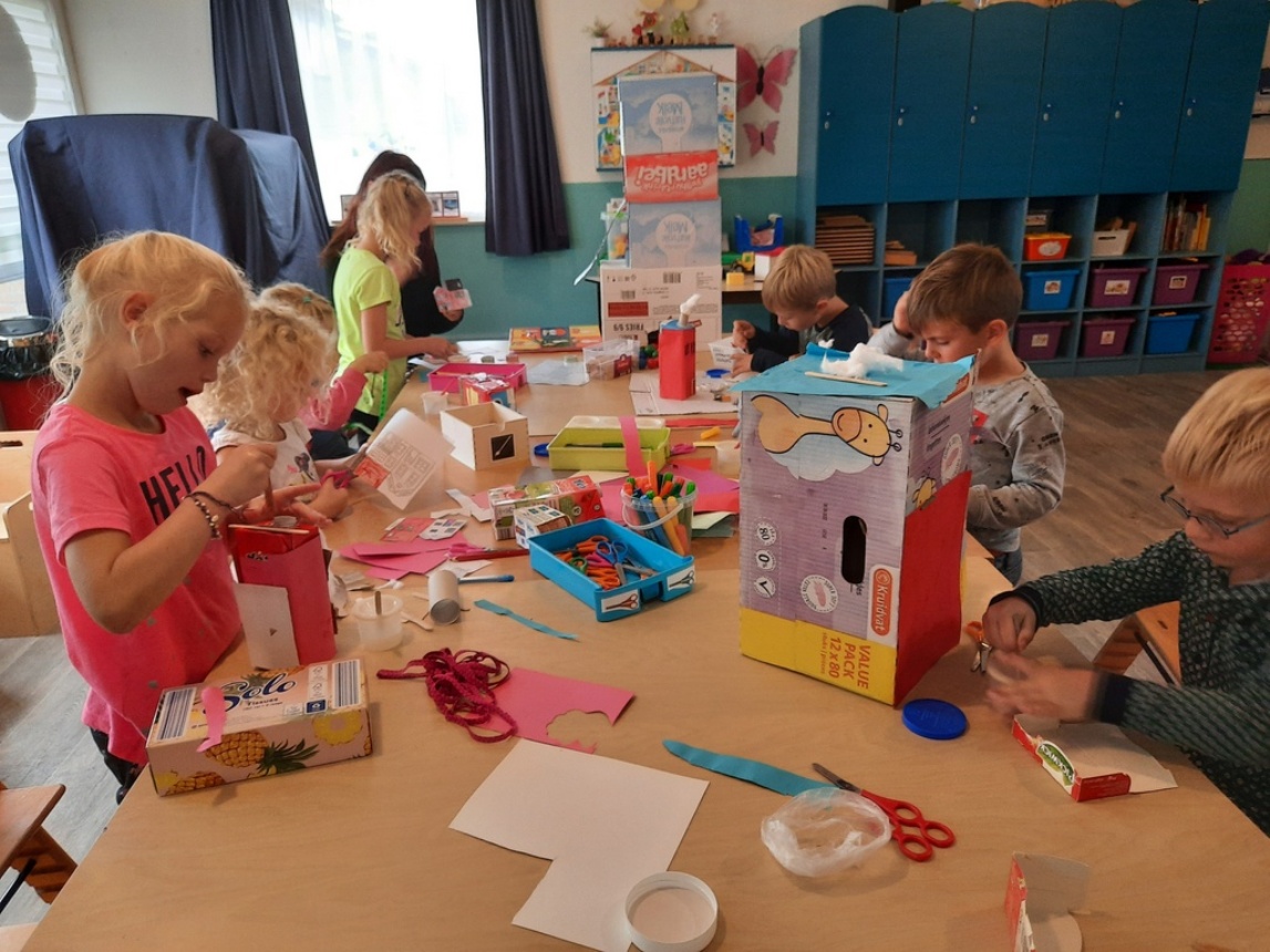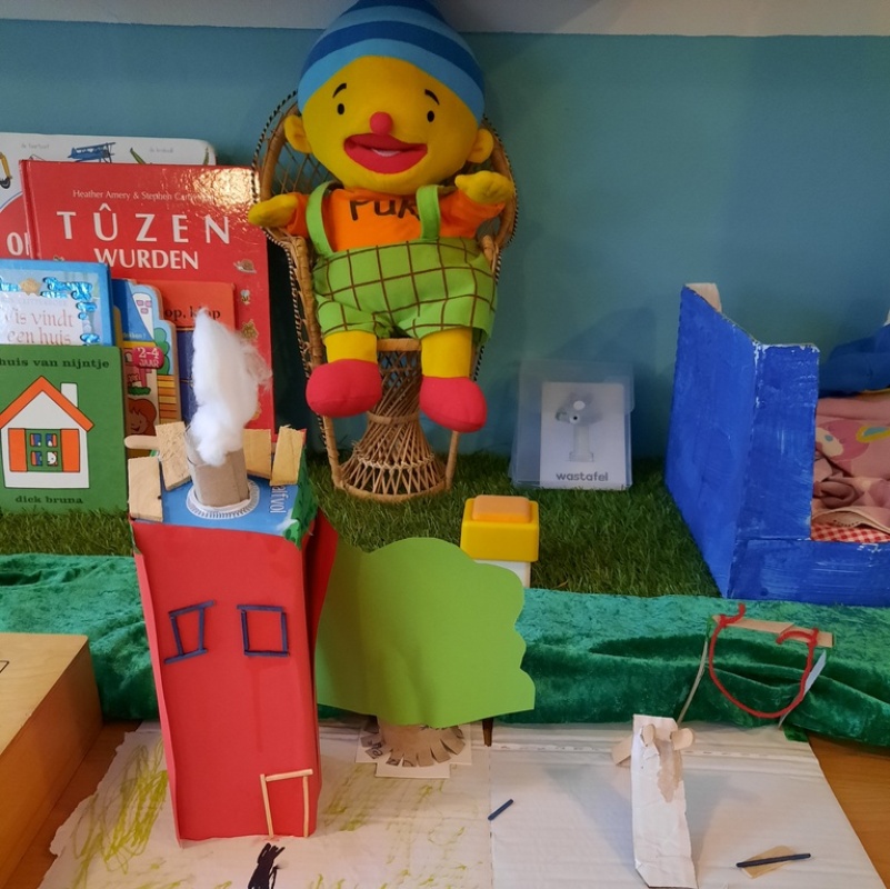 Tevens hangen er foto’s van de huizen van alle peuters en peuterjuffen in de opvangruimte, ook deze verschillende huizen werden besproken. Niet alleen de peuters, maar ook de BSO kinderen zijn druk ik de weer met het thema. Ze maken prachtige bouwwerken van verschillende materialen.
