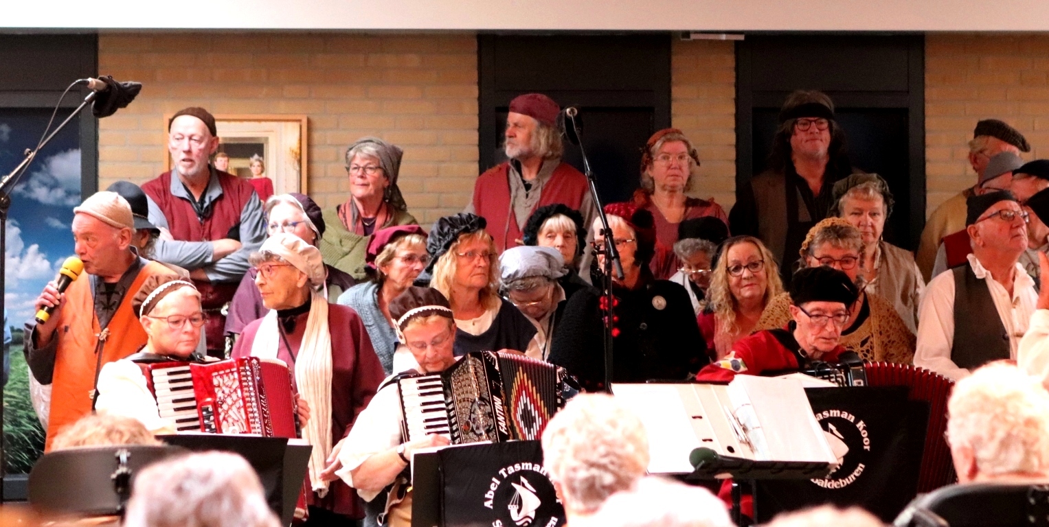 KOLLUM – Donderdagmiddag was er een optreden van het Abel Tasman koor in Meckama State te Kollum voor bewoners en belangstellenden. Het koor trad op in nagemaakte 17e-eeuwse kledij. Er werden prachtige liederen gezongen zoals de traditionele shanties- en zeemansliedjes in diverse talen.