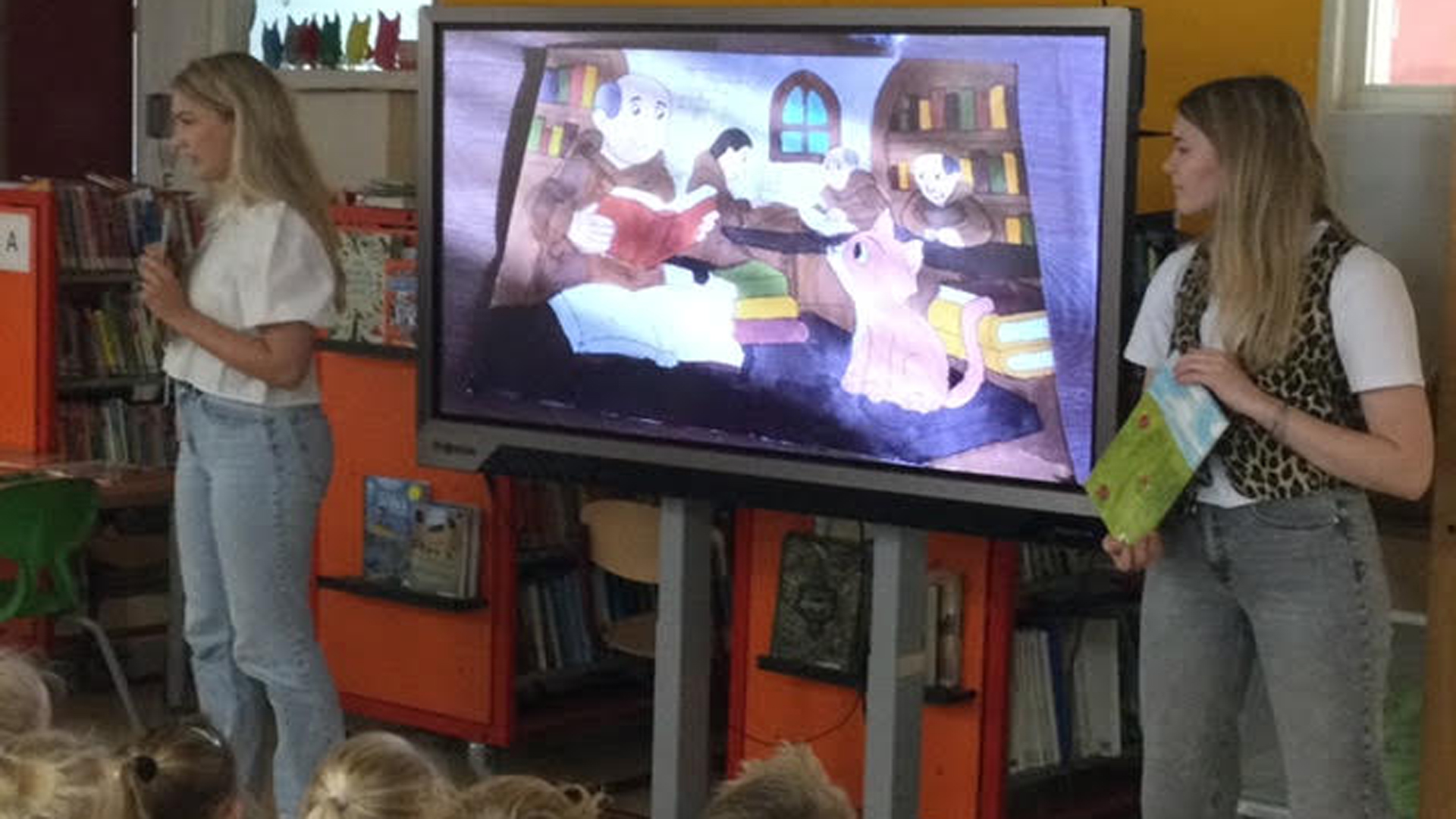 Presentatie prentenboek over klooster Claerkamp aan leerlingen van de Tarissing