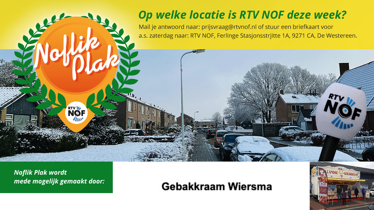 Ook dit seizoen is er weer een prijsvraagrubriek: Noflik Plak. Elke week ligt de RTV NOF microfoon op een andere plek in Noordoost Fryslân. Weet jij waar? Laat het ons voor zaterdag 2 december weten via: prijsvraag@rtvnof.nl en win een leuke verrassing van één van onze sponsoren.