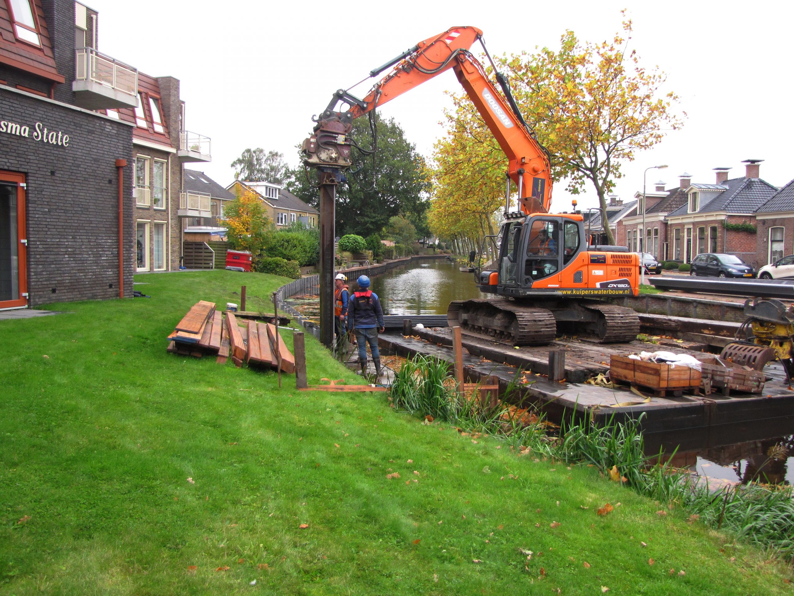 KOLLUM -En opdracht van de gemeente Noardeast-Fryslân wordt er regulier onderhoudswerk aan de oude damwanden aan de Kollumer trekfeart (aan de oostkant) ter hoogte van Eyso de Wendtstraat in Kollum vervangen door kunststof damwanden van 6 meter, de damwanden werden in de grond getrild met trilblokken.