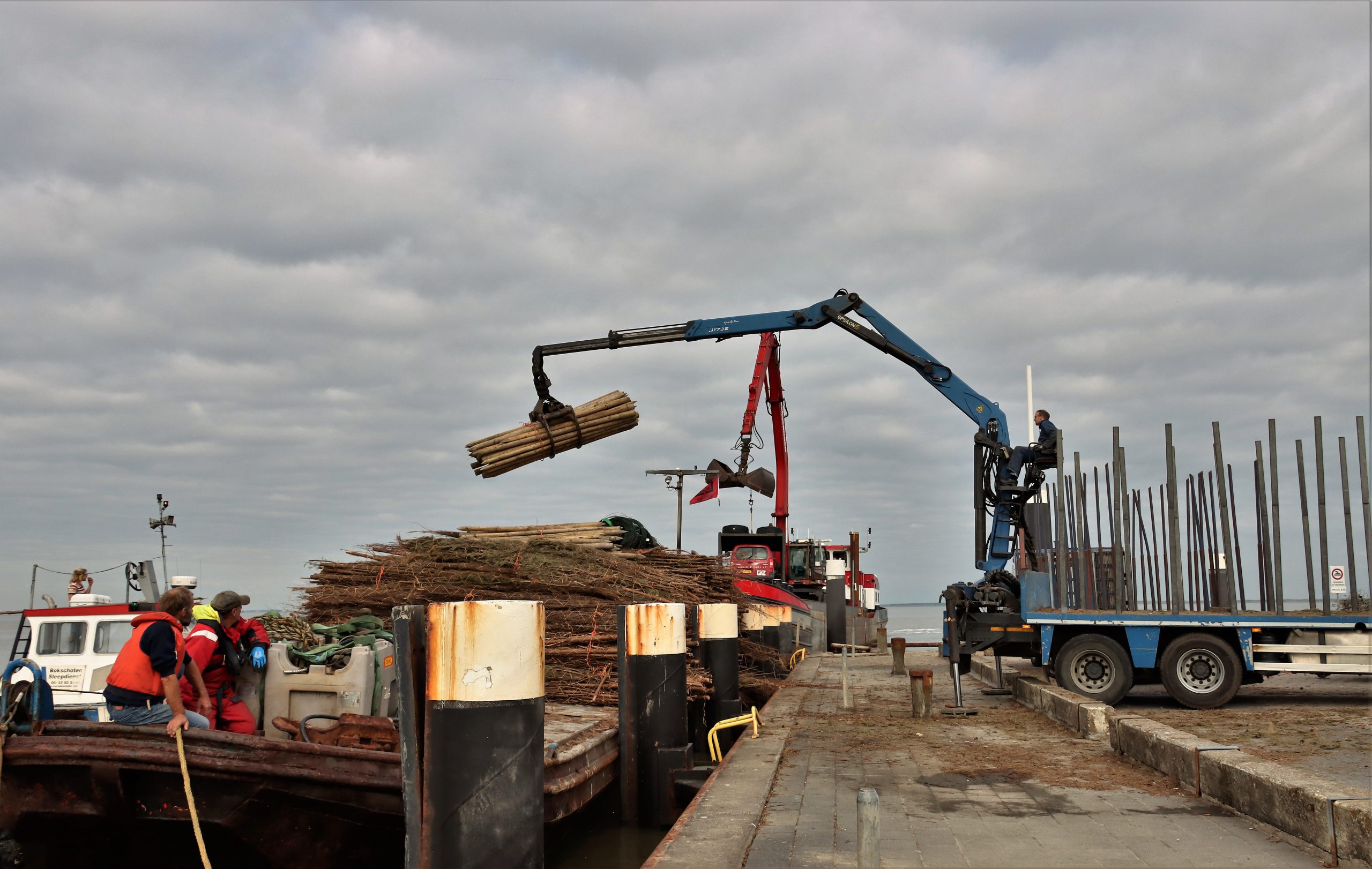 Deze werkzaamheden worden jaarlijks uitgevoerd door Rijkswaterstaat, ze zijn nu ter hoogte van Blija aan het werk en het laden en lossen gebeurt op de pier bij Holwerd waarna een sleepboot het materiaal naar zijn plek in zee sleept om geplaatst te worden!