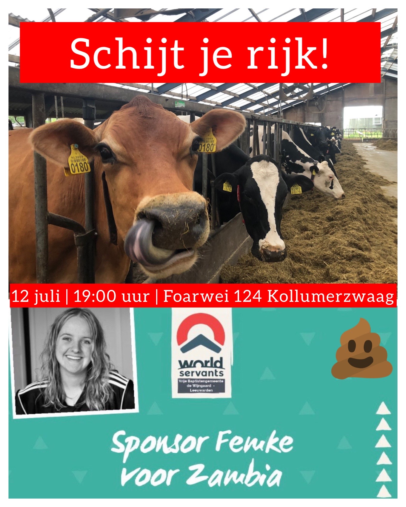Dinsdagavond 12 juli organiseert ze een ludieke actie in Kollumerzwaag om geld voor het project op te halen: Schijt je rijk! Op een weiland met 100 vakken van 1×1 meter wordt op dinsdagavond 12 juli om 19.00 uur een koe losgelaten. U kunt een vak kopen voor € 10,- via de actiepagina. Meerdere vakken mag natuurlijk ook, hoe groter de kans dat u wint!