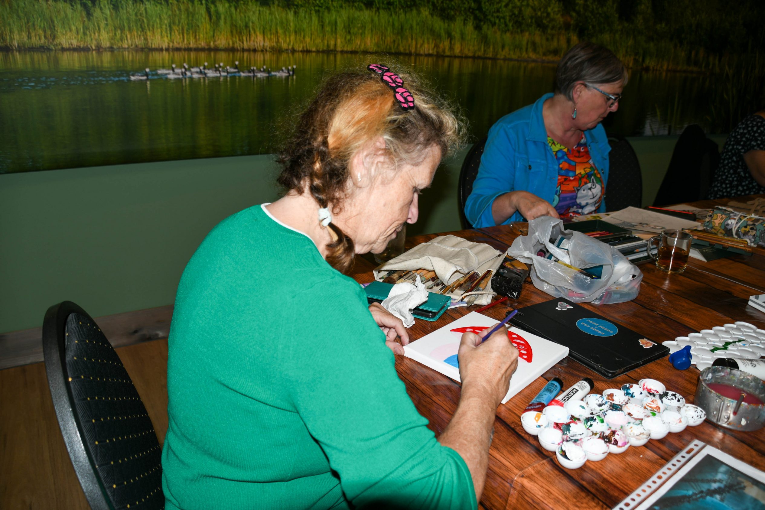 Je kunt schilderen op verschillende manieren, aquarel, tekenen met kleurpotloden en olieverf schilderen. Er is voor ieder wel wat wils. Het is laagdrempelig, je hoeft geen Rembrandt te zijn. Er is geen docent bij, maar er zijn wel zeer ervaren mensen, die je graag helpen en adviseren.