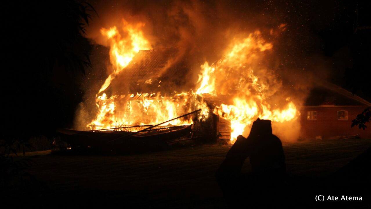 Zaterdagavond is aan Skieppereed in Ee een schuur naast een woonboerderij compleet in vlammen opgegaan. Rond 23:30 uur brak er door onbekende oorzaak brand in de schuur uit. Via 112 werd er direct alarm geslagen en de meldkamer ingeschakeld. De meldkamer zorgde ervoor dat de brandweer van Anjum gealarmeerd werd. De blusgroep van Anjum rukte snel uit en zag tijdens het aanrijden de brand in verte al. Er werd besloten om op te schalen naar het sein ‘middel-brand’, waardoor de brandweer van Ternaard ook werd gealarmeerd.