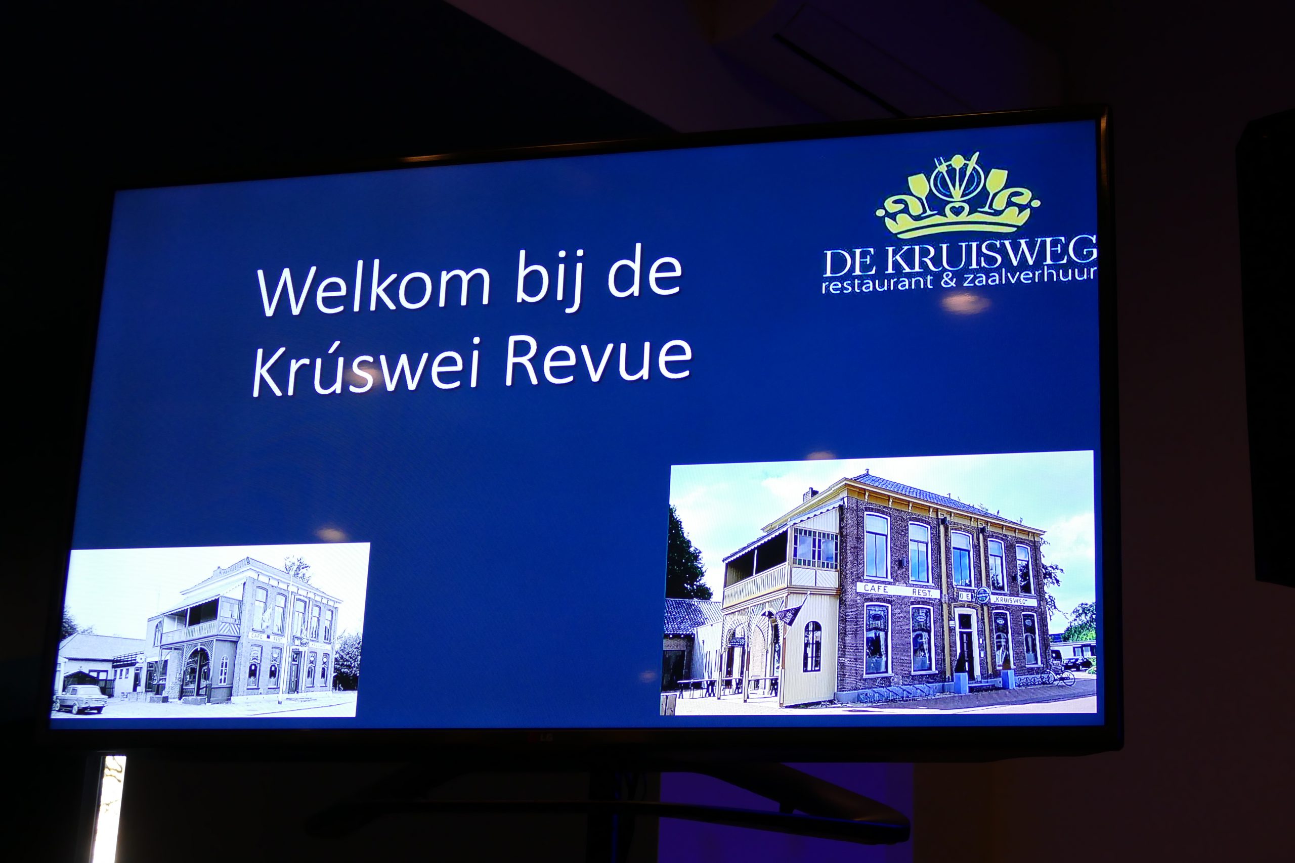 Sietse Hilverda had deze avond de presentatie en dat voelt vertrouwd bij de Damwâldsters. Verder was de techniek in handen van Evert Groenensteijn en zijn team. Na EZG een foto overzicht van Femme Haakma vanaf 1881 tot 2000. Ook deze avond een prachtig optreden van het gospelcombo Sign met liederen als Leun op mij en Love shine a light. Gestart werd met het mooie lied The Rose van Bette Midler. EZG en Sign pasten zeker bij deze revue. Maar dat gold ook voor de toneel vereniging van Damwâld “Hjir binne we dan”. Met hun grappige sketches over Krúswei verhalen hadden ze de lachers op hun hand. Vooral het reisje naar Ameland op de solexen werd een prachtig optreden. Dat had ook Geert Kempenaar met het verhaal over Siebrens Matsje en it tramke. Het publiek genoot met volle teugen net voor de pauze over enkele bruiloften in de Krúswei, die werd afgesloten met een krachtig brandweer sirene geluid.