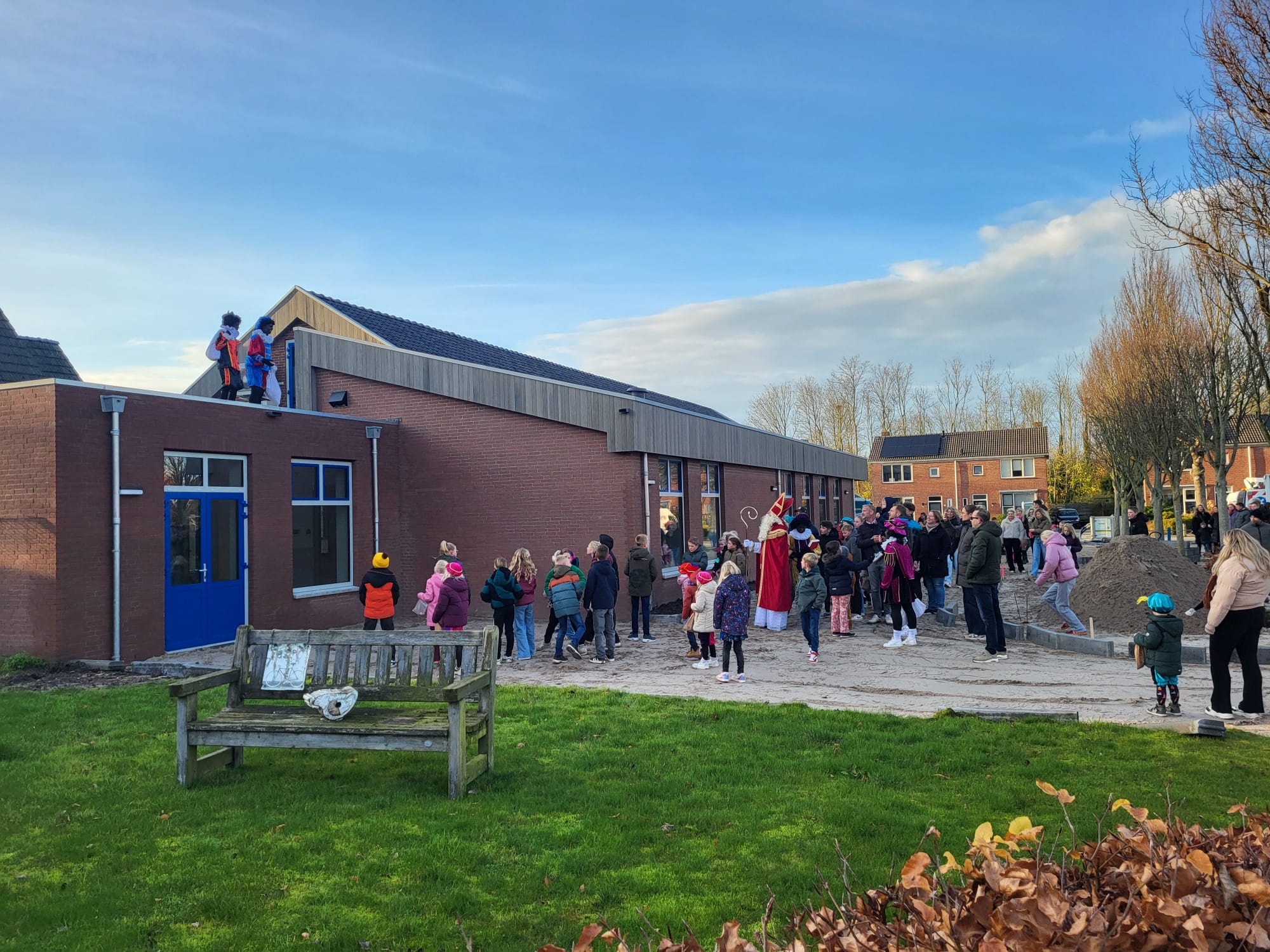 Dit wisten de kinderen wel te vinden. De nieuwe school in aanbouw was inderdaad de plek waar Sinterklaas te vinden was. Hij wilde alvast even polshoogte nemen. De Pieten hadden ondertussen een mooi plekje gevonden op het platte dak waar ze alle kinderen en belangstellenden konden gadeslaan.