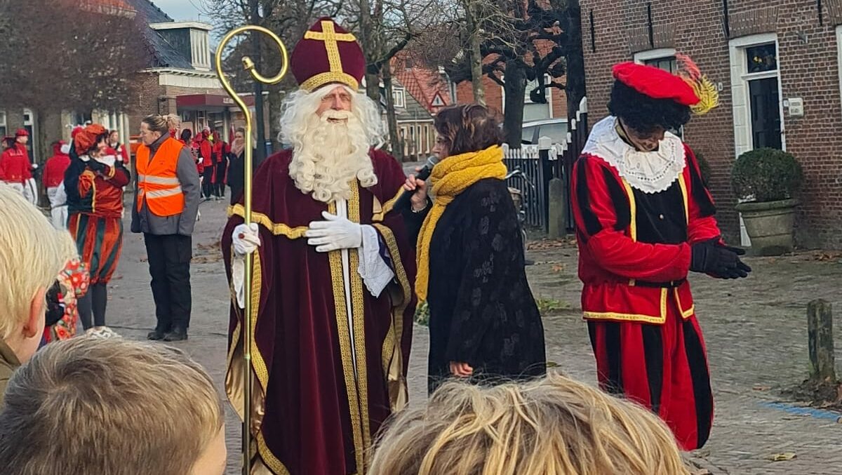 De aankomst vond plaats op het Breed, midden in het dorp. Daar stonden al veel kinderen klaar, samen met hun ouders. Ook muziekvereniging De Marko’s was aanwezig, compleet met drumband, twirlers en color guards. Sinterklaas kreeg een warm onthaal.