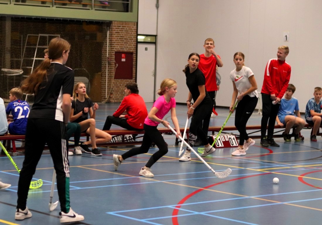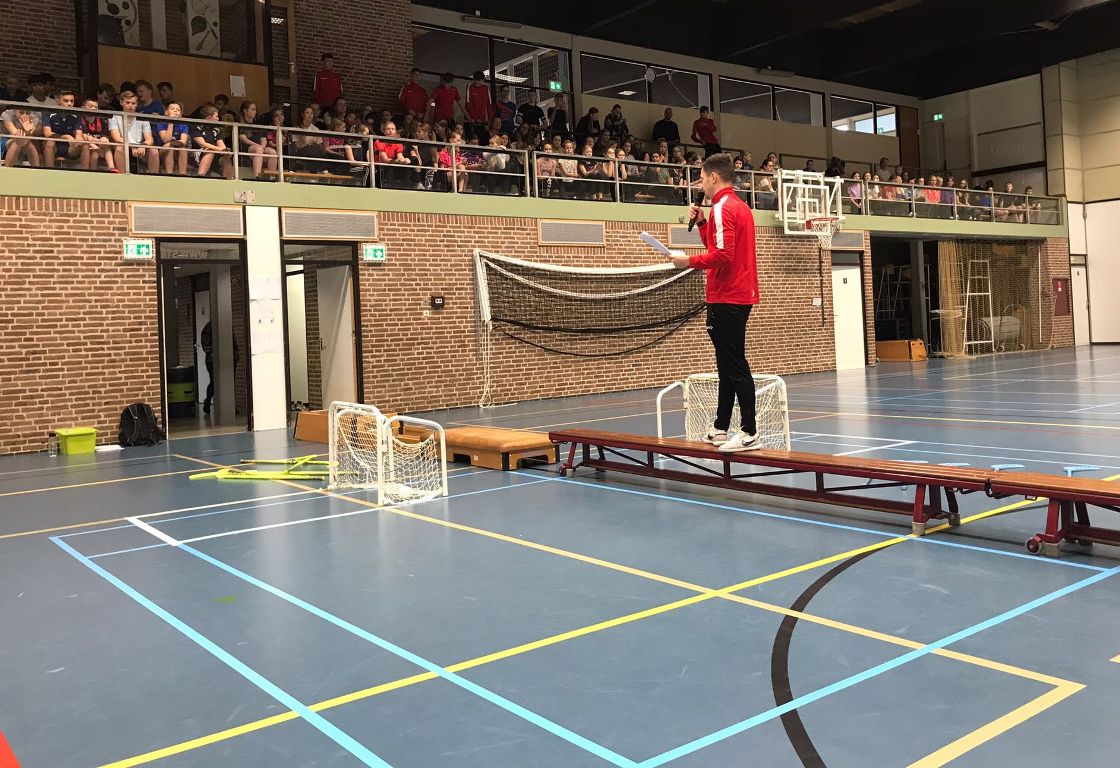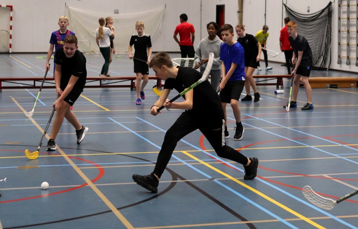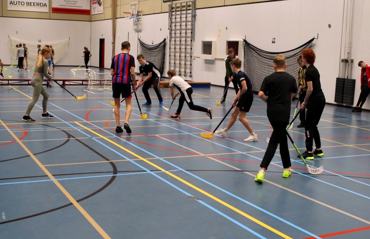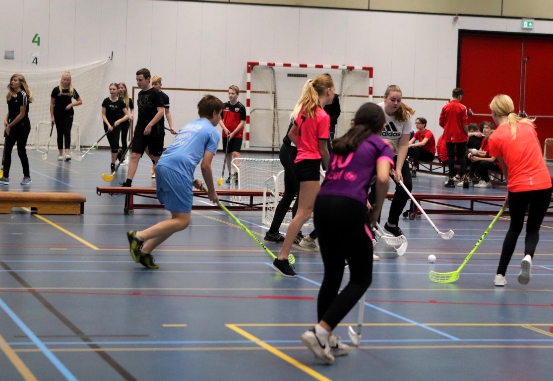 Donderdagochtend stonden zij vroeg op de stoep van de van der Bij-hal, om alles gereed te maken voor de sportdag. Om half 9 druppelden zo’n 150 leerlingen van de onderbouw de zaal binnen. Na het welkomstwoord gingen zij fanatiek aan de slag met unihockey!