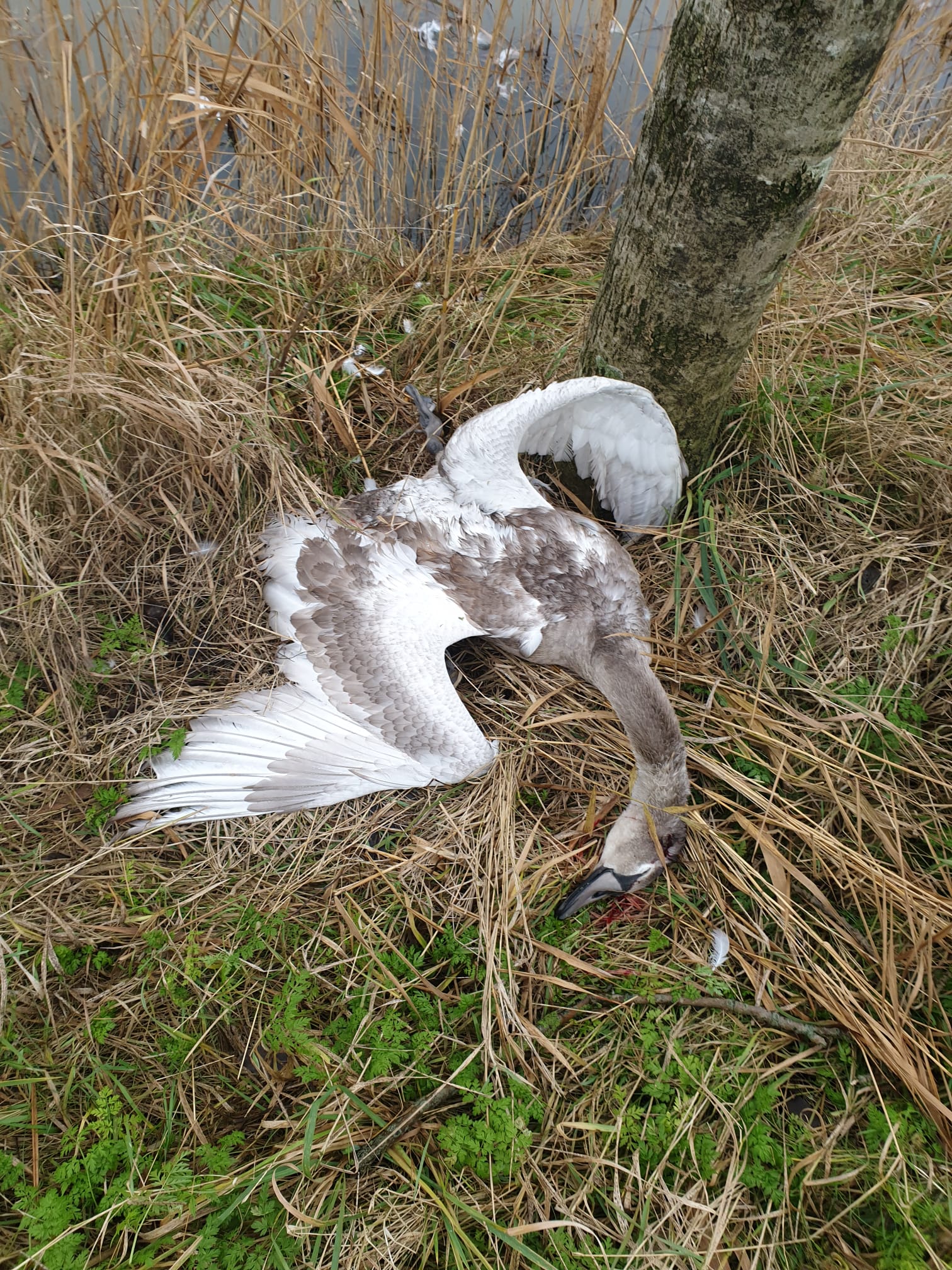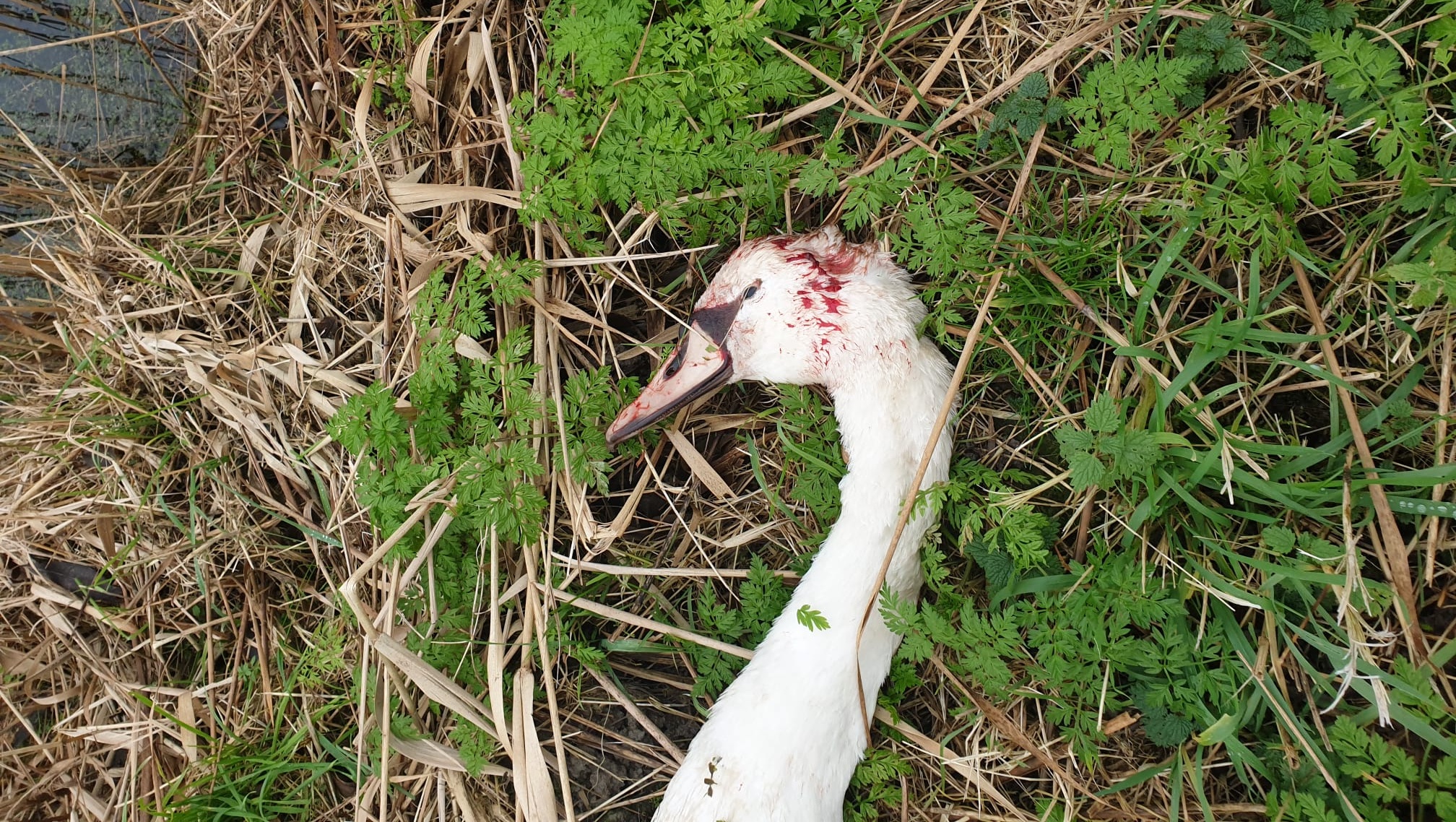 De volwassen zwaan leeft nog wel, maar als hij niet snel opknapt, moet hem verder lijden bespaard worden en laten ze hem inslapen. De politie doet nader onderzoek.