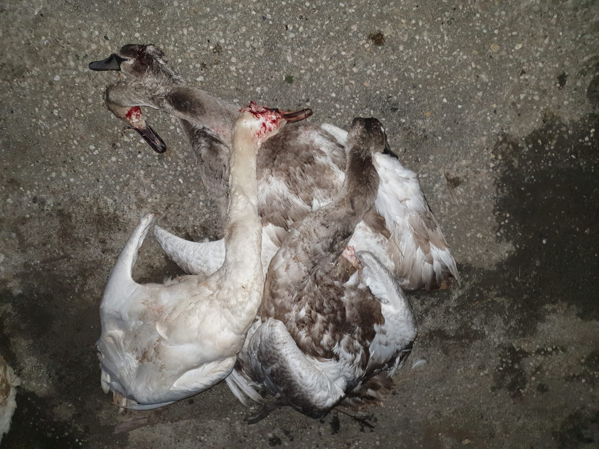 Er werd contact opgenomen met de Fûgelpits in Moddergat. Rinaldo Korst van de Fûgelpits ging kijken bij de zwaan en bij de sloot en zag daar ook nog vijf jonge zwanen dood in de sloot liggen. De zwanen zijn nu bij de Fugelpits. Rinaldo verbaast zich, dat een stabij dit doet. Er wordt nog onderzoek gedaan of de zwanen met vogelgriep besmet zijn, zodat de hond ze met gemak kon benaderen.