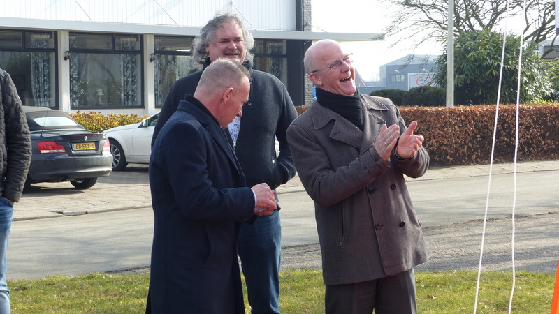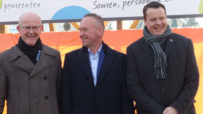 Foto: starthandeling van de officiële opening KiK Feanwâlden door gedeputeerde Johannes Kramer, wethouder Roelof Bos en bedrijfsleider KWS Infra BV Roel van den Berg.