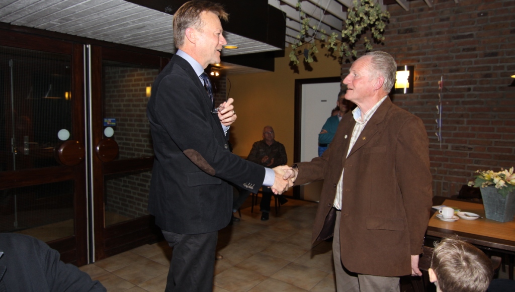 Hierna werd namens het hoofdbestuur van de bond de heer Klaas Sneijder aan de heer Henk Dijkstra uit Kollum de speld uitgereikt van bijzonder verdienste en wel voor 25 jaar lidmaatschap de Edelzangers sekretaris 6 jaar Avicultura Kollum 4 jaar ringencommesaris Avicultura kollum secretaris edelzangers 1991 tot heden t.t secretaris 1993 tot heden en rayonsecretaris vanaf 2001 tot heden